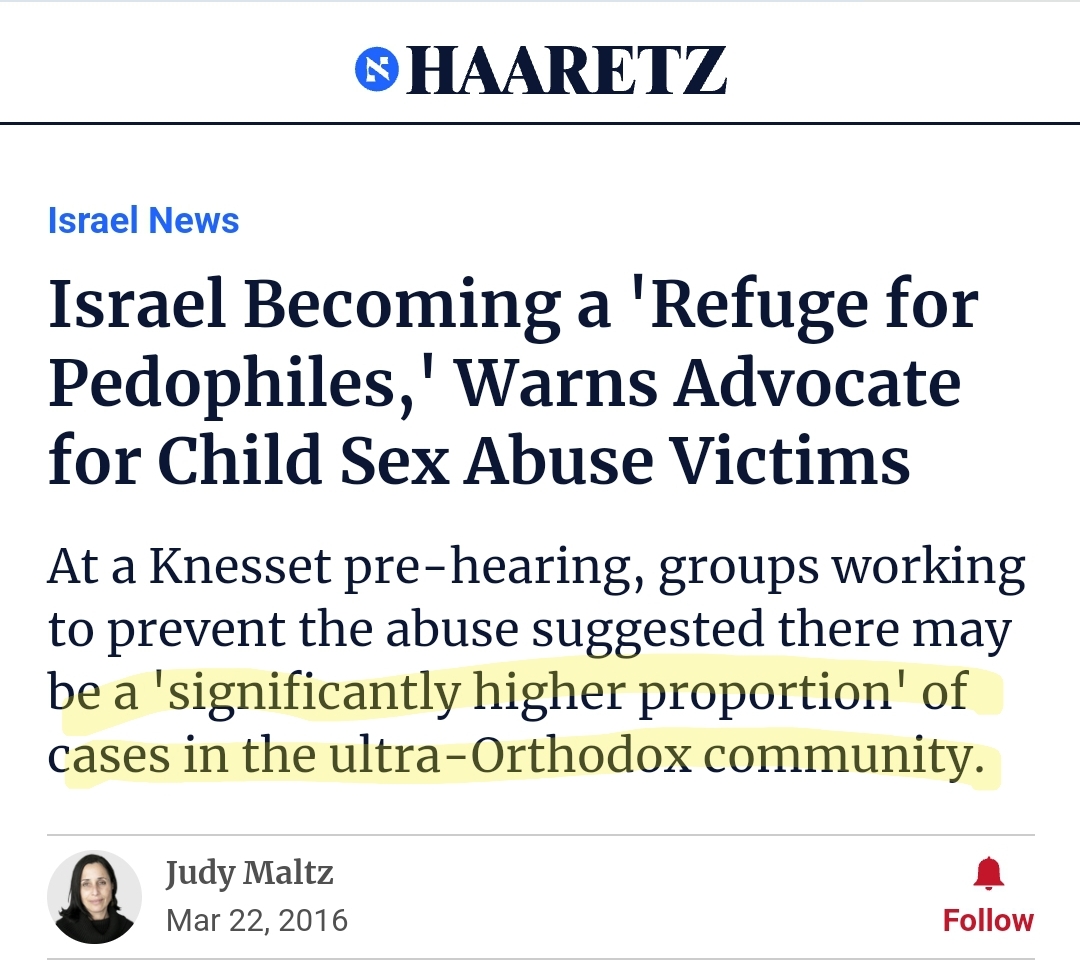 "The child sex abuse crisis in ultra-Orthodox Judaism, like that in the Catholic Church, has produced its share of shocking headlines in recent years. "In New York, and in the prominent Orthodox communities of Israel and London, allegations of child molestation and rape have been rampant. "The alleged abusers are schoolteachers, rabbis, fathers, uncles—figures of male authority. The victims, like those of Catholic priests, are mostly boys."