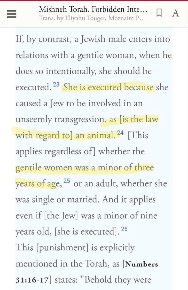(8) If a Jew rapes a non-Jewish child (e.g., 3-year-old), the child is to be executed. Note: This is not from the Talmud. This is from the Mishneh Torah, one of the most authoritative books of Jewish law, by Maimonides. https://t.co/E77rteDOMe