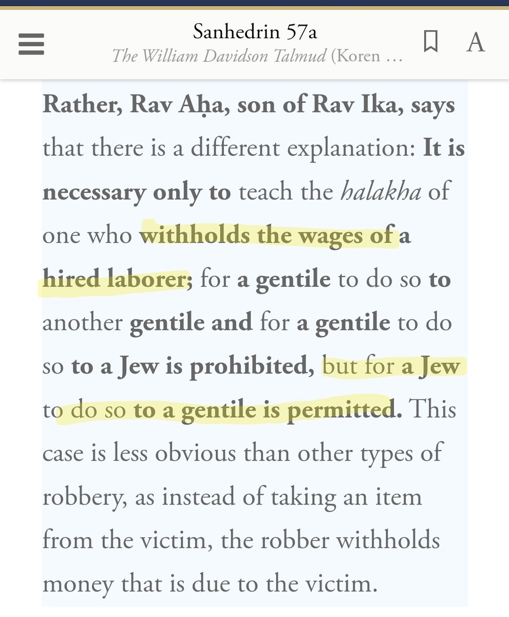 (9) It is permissible to cheat a non-Jewish employee by refusing to pay them their wages (although the Talmud considers this a matter of debate, such that there are some rabbis with different views) https://t.co/aHspA9KeTE
