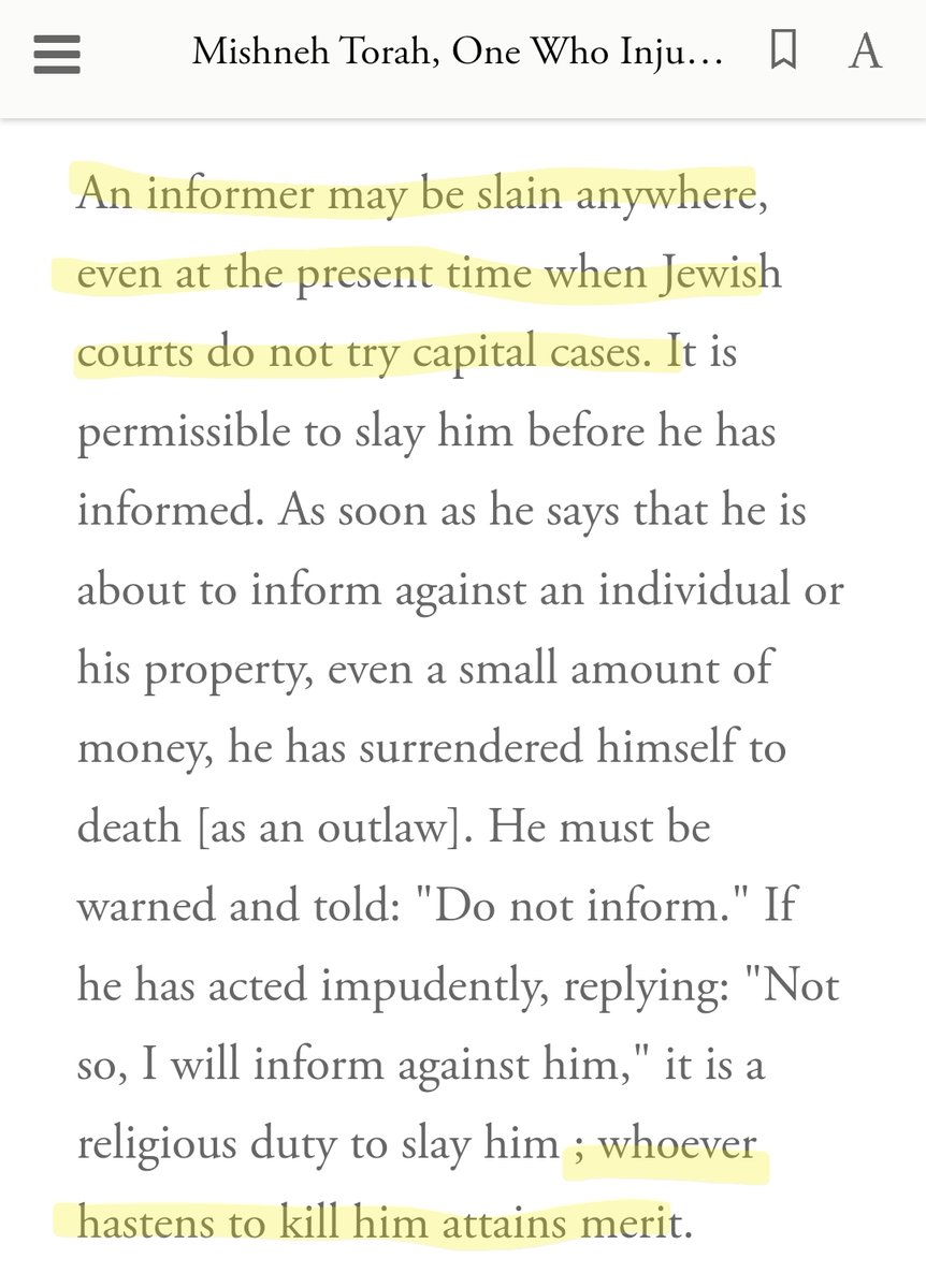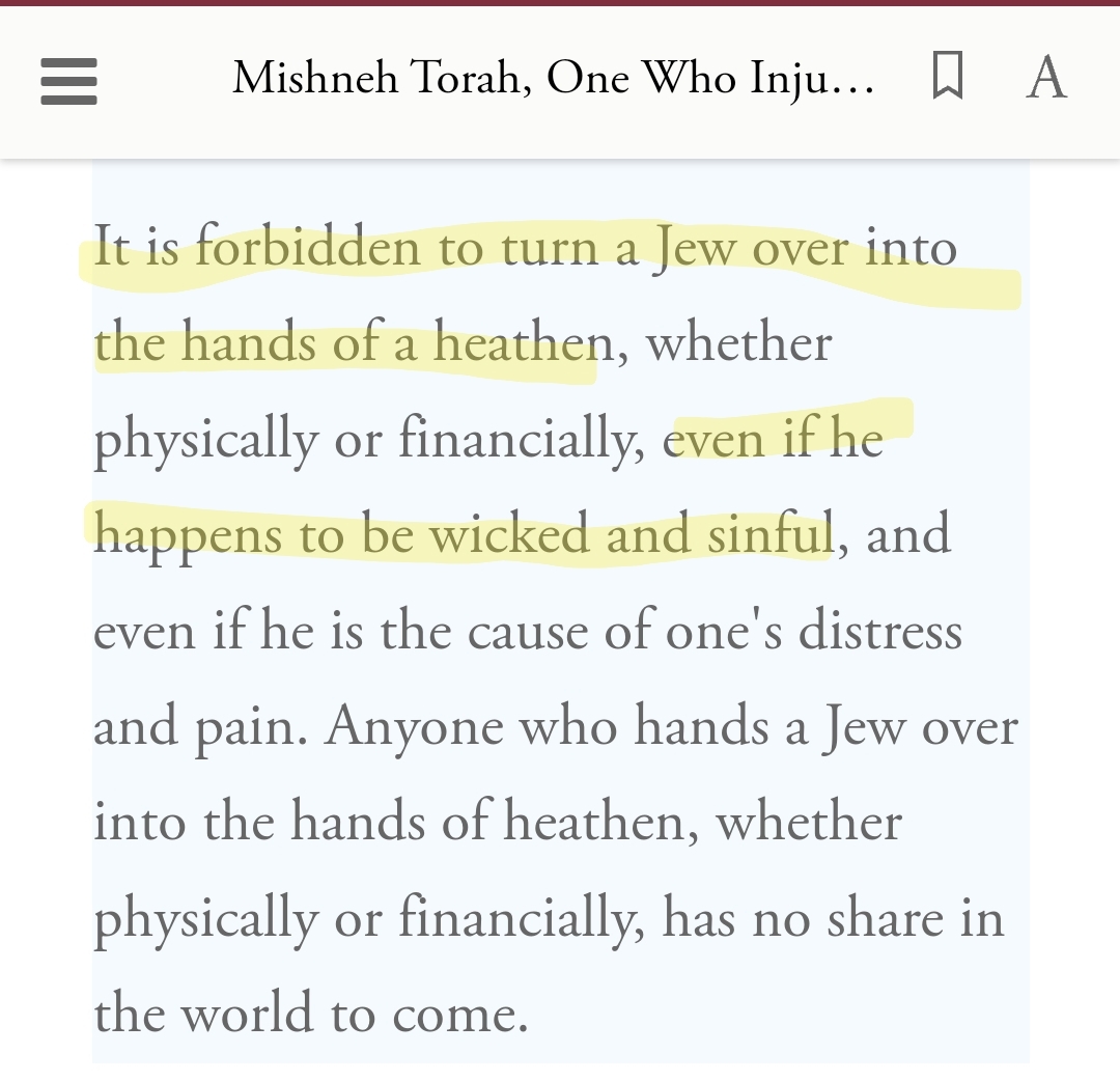 (16) When a Jew commits a crime against a non-Jew, other Jews must work to conceal it. Any Jew who reports the crime is to be assassinated. This is the Law Against Mesira (Whistleblowing) It is found in the Talmud Bava Kamma 117a. Screenshot is from Mishneh Torah. https://t.co/v9bs0HahVd