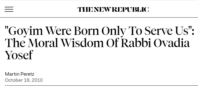 The New Republic quotes the "moral wisdom" of chief Rabbi Israel, Ovadia Yosef: “Goyim were born only to serve us. Without that, they have no place in the world – only to serve the People of Israel,” he said in his weekly Saturday night sermon... “In Israel, death has no dominion over them... With gentiles, it will be like any person – they need to die, but [God] will give them longevity. Why? Imagine that one’s donkey would die, they’d lose their money."