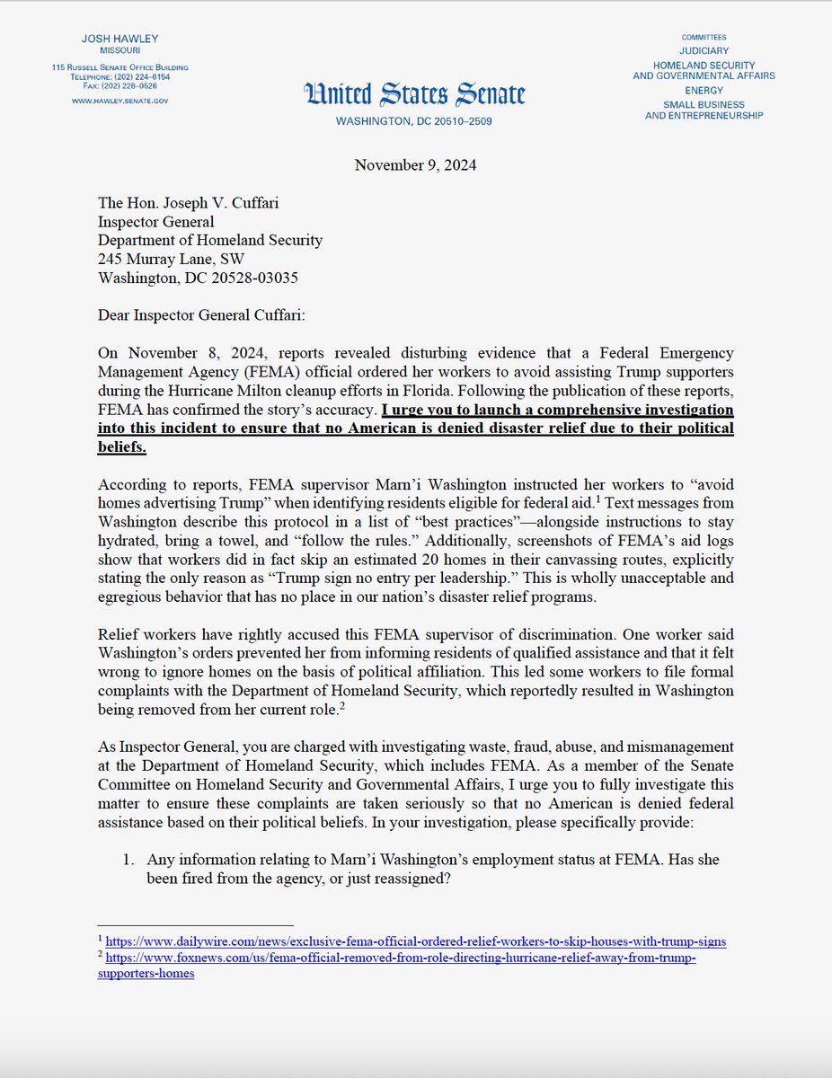 FEMA officials discriminated against Trump voters? Totally illegal. I’m asking the Inspector General to launch a full investigation immediately. Everyone involved needs to be identified, fired - and if necessary, prosecuted https://t.co/GGoJUcgneb