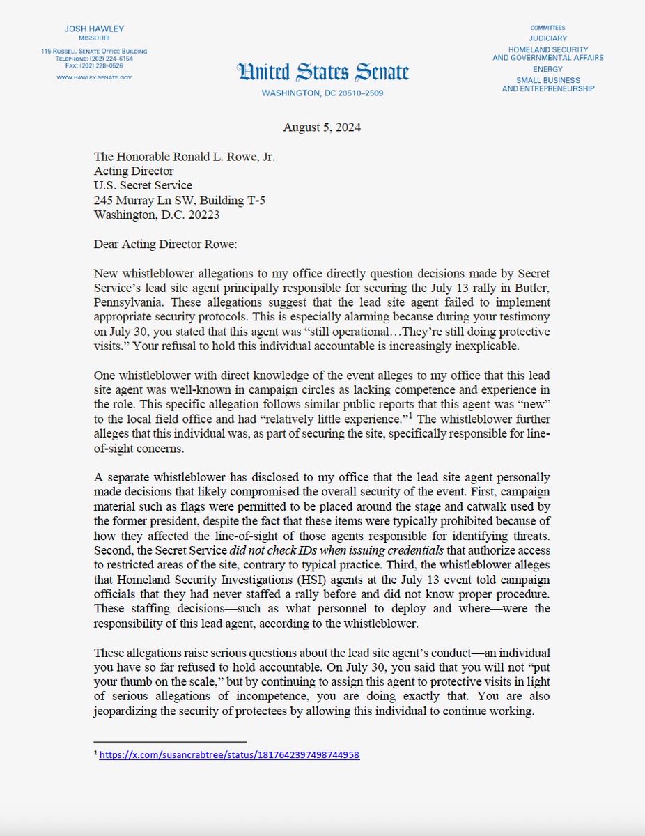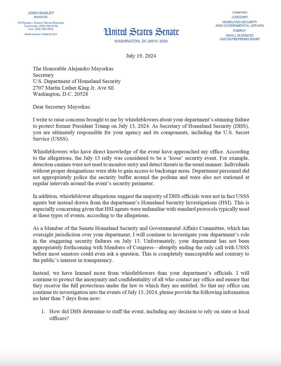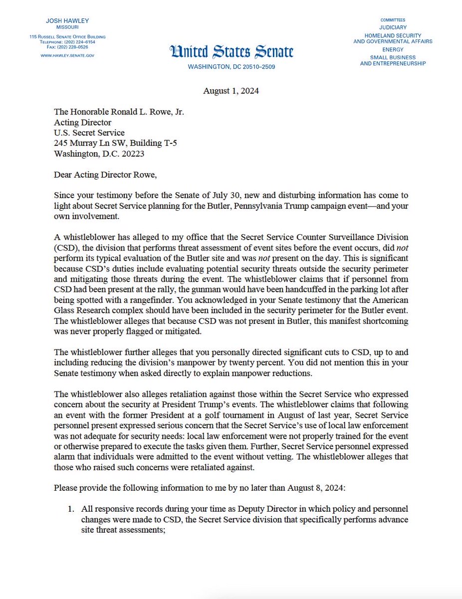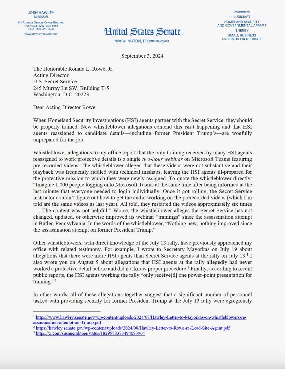 🚨🚨NEW - My letter to Secret Service Director Rowe detailing new whistleblower allegations that Homeland Security agents working the Butler Trump rally received only “webinar” training beforehand https://t.co/KQZbgDf7Rs