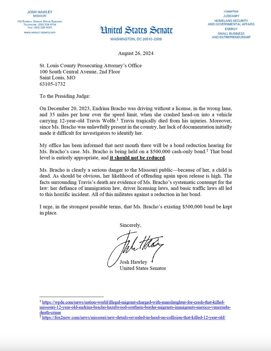 I am told the criminal illegal alien who murdered 12-year-old Travis Wolfe of St. Charles has been released pending a future trial. This is a gross miscarriage of justice. She killed Travis one year ago today. She is present in the U.S. illegally & a flight risk. She should be in prison every single day until tried