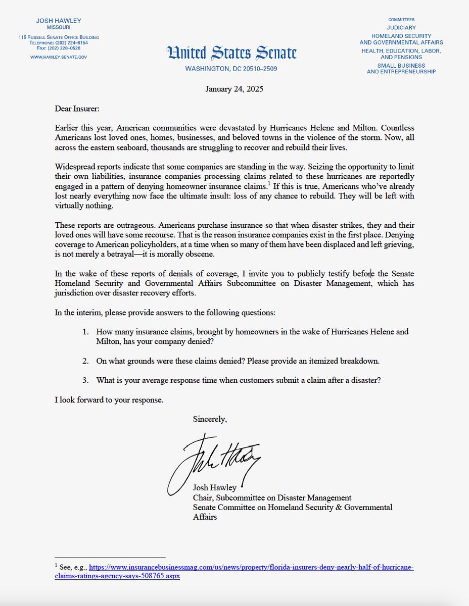 Today I am calling on the insurance companies that are bankrupting good Americans by denying thousands of claims from Hurricanes Helene and Milton to come to the Senate and testify UNDER OATH https://t.co/qf9WKPfMzD