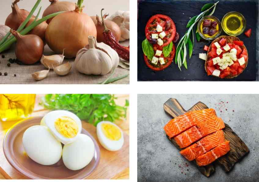 Some foods help to protect against free radical damage from the sun. This is because they are rich in antioxidants like vitamin A, polyphenols, vitamins, minerals, and healthy fats. The following foods to eat for sun protection are linked to a reduced risk of melanoma skin cancer according to one research study in Northern Italy. From this study, eggs and extra virgin olive oil are likely the best foods that help repair skin damage. Interestingly, meats and fish are somewhat protective as well. This could be because they are nutrient-rich foods that have high nutrient density, vitamin content, and collagen content. Sun Protection Foods List Eggs are rich in vitamin A and protein building blocks for skin protection and may be the best SPF food out there. Extra Virgin Olive oil is considered one of the natural sunscreen foods because it contain polyphenols and anti-inflammatory fats for skin buffering from harmful UV rays. Onions and garlic are rich in sulfur-containing antioxidants that are well known to help protect from many kinds of diseases, including skin cancer. Fish contains anti-inflammatory essential fatty acids that protect the skin. Organ meats are rich in vitamins, minerals, and antioxidants like vitamin A that protect against UV damage. Yogurt contains probiotics which can help dampen inflammation in the body. Berries such as blackberries, raspberries, pomegranates, and strawberries are rich in an antioxidant called ellagic acid. This compound protects the skin and may reduce melanoma risk. Green tea contains antioxidants that may reduce UV damage to the skin and protect from skin cancer. Tomato paste is a concentrated form of tomatoes that is rich in antioxidants like beta carotene and lycopene, which is related to reduced skin cancer risk. Other vegetables rich in these antioxidants are sweet potatoes and winter squash. Coffee intake, but not decaffeinated coffee, is related to a reduced risk of skin cancer in some but not all studies. Beans and peas preferably fermented ones like natto and tempeh contain antioxidants that may help protect the skin. Foods to Avoid for Sun Protection Some foods may contribute to skin damage and sun damage. This is because they can cause the body to use up its antioxidant and vitamin stores. You will notice that most of these foods are processed foods. They often contain processed seed oils which have high amounts of free radicals. Indeed, another study found that processed carbohydrates that are high on the glycemic index significantly increase the risk of melanoma in women. For healthy eating to protect the skin you should minimize or avoid the following: Cereal Candy Sugar Pasta Crackers Cabbage Cakes Biscuits Alcohol Interestingly, cabbage intake is related to an increased risk of melanoma. In the study, the authors suggest that the reason for this may be that cabbage has high levels of heavy metals depending on where it is grown. Dietary Supplements for Sun Protection While having moderate sun exposure and healthy foods are important, some research indicates that key additional dietary supplements may help protect from skin damage too. Vitamins for sun protection are a relatively new concept, but some research shows they can be beneficial. The following nutrients and vitamins may help protect skin health: Collagen supplements may reduce the harmful ultraviolet rays to the skin that cause skin damage. Vitamin C combined with vitamin E helps protect from sunburn. Astaxanthin is an antioxidant that helps protect skin from UV damage. Vitamin A as retinol applied topically and taken as vitamin A supplements helps prevent the absorption of harmful UV rays. Cod liver oil and fish oil supplements reduce the chances of sunburn. They also help reduce skin inflammation. Resveratrol is one of the best antioxidants for sun protection. It protects the skin against harmful free radicals from the sun. Vitamin D supplementation reduces the redness and damage from UV sun exposure. Plus, vitamin D has many other benefits for bone health, joint health, and immune health. Turmeric is a natural spice rich in the antioxidant curcumin that has the potential to help many skin conditions, including acne, dermatitis, as well as UV aging. Nicotinamide is a form of niacin that helps to reduce the risks of the types of skin cancer called basal cell carcinoma and squamous cell carcinoma. According to Harvard Health, 500 mg twice per day is recommended. Foods that Cause Sun Sensitivity Some foods may increase sun sensitivity if eaten in large amounts or frequently. Foods that contain furanocoumarins increase the chances of sun damage. The foods that contain furanocoumarins are celery, parsley, mulberry, legumes figs, and citrus fruits. They may be especially sensitizing for people with light skin tones. Most commonly, however, these cause skin irritation and redness if they touch the skin, not eating, such as when people get citrus juice on their hands, then followed by sun exposure. A deficiency of niacin, also known as vitamin B3, can also cause sun sensitivity.