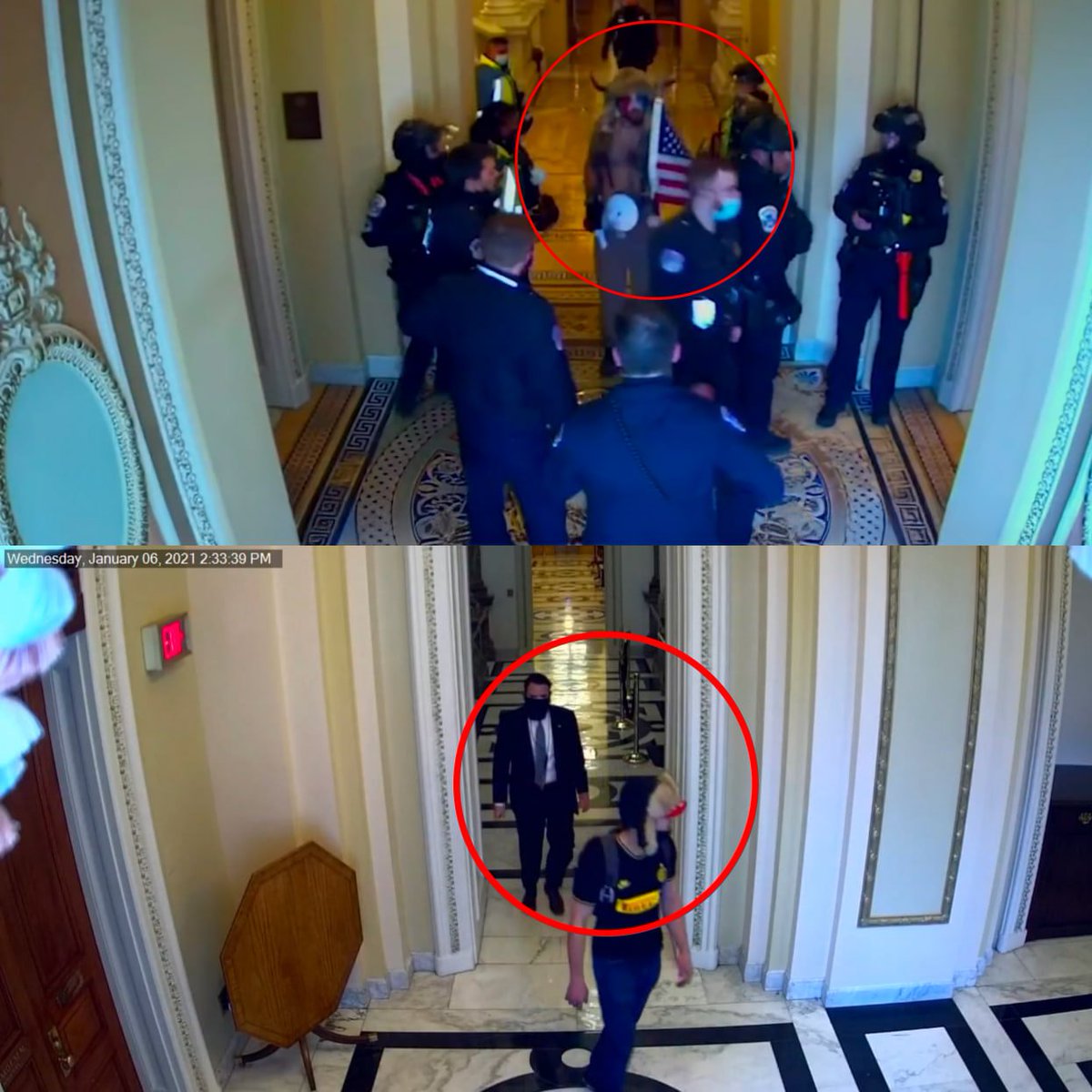 You've probably already seen it, but notably @ 0:28 mark, CCTV footage from the West House Corridor facing into the North House Corridor, by the Ways and Means Committee doors; Zach was waiting in the North Staircase before being escorted to the police line by a Capitol staffer @ 2:33 p.m.