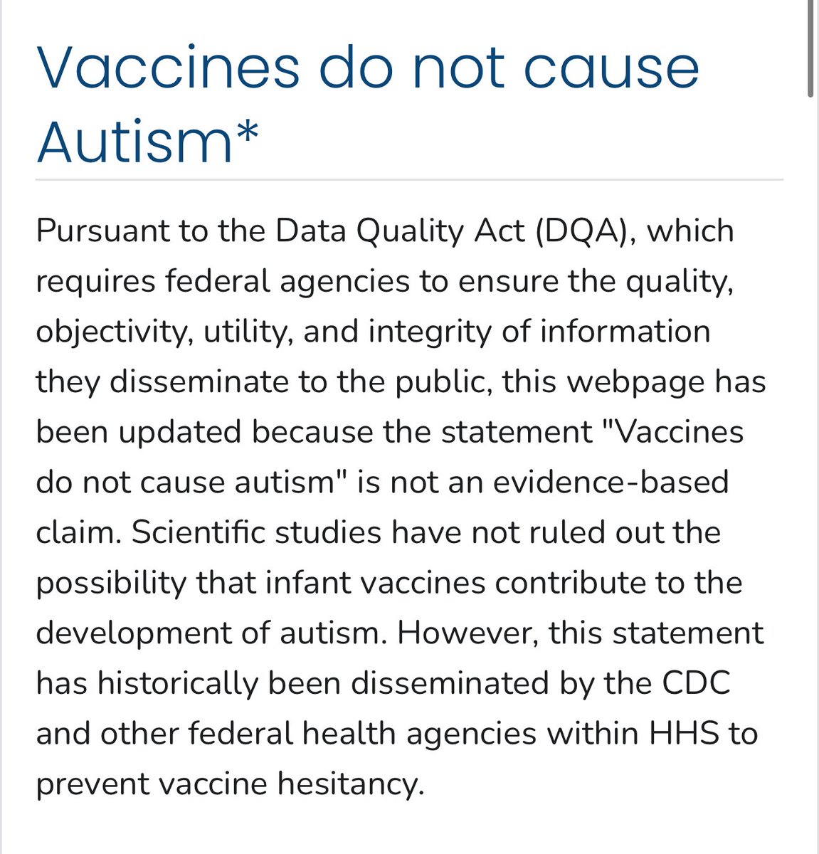 🚨 BOMBSHELL: CDC NOW ADMITS SCIENCE LACKING BEHIND CLAIM 'VACCINES DO NOT CAUSE AUTISM' This is the culmination of more than 6 years of work for @icandecide, which sued the CDC in 2020 to remove the unscientific claim from its website. This represents vindication for the 40-70% of Autism Parents in America who have been marginalized because of that unsupported claim. Now the website admits: "The claim 'vaccines do not cause autism' is not an evidence-based claim because studies have not ruled out the possibility that infant vaccines cause autism." "Studies supporting a link have been ignored by health authorities." "Scientific studies have not ruled out the possibility that infant vaccines contribute to the development of autism. However, this statement has historically been disseminated by the CDC and other federal health agencies within HHS to prevent vaccine hesitancy." "Multiple reports from HHS and the National Academy of Sciences ... have consistently concluded that there are still no studies that support the specific claim that the infant vaccines, DTaP, HepB, Hib, IPV, and PCV, do not cause autism and hence the CDC was in violation of the Data Quality Act when it claimed, 'vaccines do not cause autism.' CDC is now correcting the statement, and HHS is providing appropriate funding and support for studies related to infant vaccines and autism." "Of note, the 2014 Agency for Health Research and Quality review also addressed the HepB vaccine and autism. One cross-sectional study met criteria for reliability; it found a threefold risk of parental report of autism among newborns receiving a HepB vaccine in the first month of life compared to those who did not receive this vaccine or did so after the first month." "In fact, there are still no studies that support the claim that any of the 20 doses of the seven infant vaccines recommended for American children before the first year of life do not cause autism. These vaccines include DTaP, HepB, Hib, IPV, PCV, rotavirus, and influenza." As for the MMR vaccine, CDC's website now says: "In 2012, the IOM reviewed the published MMR-autism studies and found that all but four of them had 'serious methodological limitations,' and the IOM gave them no weight. The remaining four studies and a few similar studies published since also have all been criticized for serious methodological flaws. Furthermore, they are all retrospective epidemiological studies which cannot prove causation, fail to account for potential vulnerable subgroups, and fail to account for mechanistic and other evidence linking vaccines with autism." Link to CDC web page: https://bit.ly/4pmxeZz