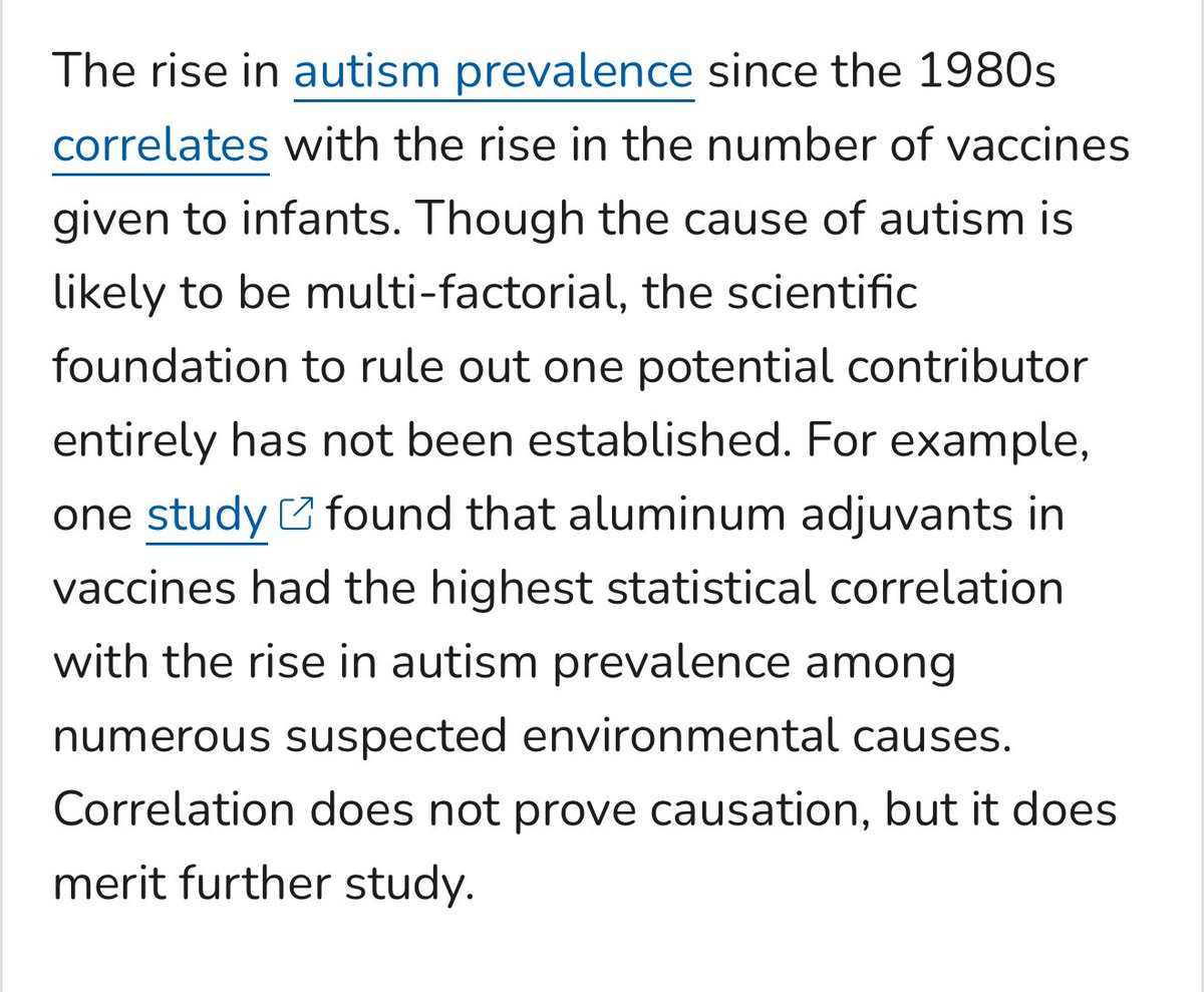 Most parents with autistic children claim vaccines - including DTaP, Hep B, Hib, PCV13, and IPV, each injected 3 times by 6 months of age - are a cause of their child’s autism.* Yet the studies to support that these vaccines do not cause autism have not been conducted. In 1986, Congress passed the National Childhood Vaccine Injury Act in which it ordered federal health authorities (HHS) to study whether pertussis vaccine can cause autism due to parental complaints regarding same. https://sirillp.com/wp-content/uploads/2024/12/1986-Act.pdf In 1991, the Institute of Medicine (IOM) issued its report on this question and could not find a single study on the question of whether pertussis vaccine causes autism. Meaning, the science had not been done. https://nap.nationalacademies.org/read/1815/chapter/2 In 2012, the IOM was again commissioned to study whether pertussis vaccine can cause autism, this time by CDC, and also the question of whether tetanus and diphtheria vaccines can cause autism (DTaP), and again the IOM could not find a single study to support the claim that these vaccines do not cause autism. Not one. But it did find one study supporting that DTaP vaccine is correlated with autism but threw it out since it was based on VAERS data. https://nap.nationalacademies.org/read/13164/chapter/12#545 In 2018, I deposed the world's leading vaccinologist about the 2012 finding by the IOM and while admitting there are no studies to support that these vaccines do not cause autism, he said he would nonetheless tell parents these vaccines do not cause autism even though he has no evidence to support that claim. https://thehighwire.com/ark-videos/do-vaccines-cause-autism-2/ In 2019, ICAN sued CDC for the studies it claims support that the vaccines given in the first six months of life do not cause autism. CDC finally identified 20 studies: 18 of those studied a different vaccine (MMR) or an ingredient not in these vaccines (thimerosal), and one irrelevant study looked at antigens. Incredibly, the final study CDC identified was the 2012 IOM review that found no studies supporting that DTaP doesn’t cause autism. https://icandecide.org/wp-content/uploads/2020/03/Stipulation-and-Order-Fully-Executed.pdf In 2020, in a lawsuit specifically about vaccines and autism, ICAN lead attorney @AaronSiriSG deposed one the world's leading vaccinologists on this topic and she admitted under oath that there were no studies to support that vaccines given in the first six months of life do not cause autism. https://thehighwire.com/ark-videos/proof-vaccines-dont-cause-autism/ This is why actually studying whether vaccines cause autism is important: https://rumble.com/v3loxq5-parents-of-triplets-describe-what-happened-after-routine-vaccination-of-all.html While CDC claimed that vaccines do not cause autism, despite demanding the studies to support this claim for the vaccines given in the first six months of life, and asking, suing, deposing, etc., for them for years, we still have not received a single such study. Given the lack of studies regarding vaccines and autism – the issue CDC and "health" authorities claimed to have most thoroughly studied – imagine the state of the "science" with regard to the 100 other serious harms (often immune or immune-mediated disorders) parents claim are caused by vaccines. https://ncbi.nlm.nih.gov/pubmed/16685182; https://ncbi.nlm.nih.gov/pubmed/25398603 https://www.ncbi.nlm.nih.gov/pmc/articles/PMC1448378/ Read our Vaccine Safety Debate with HHS: https://icandecide.org/vaccine-safety-debate/