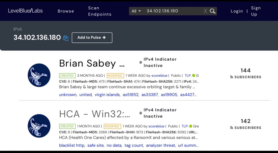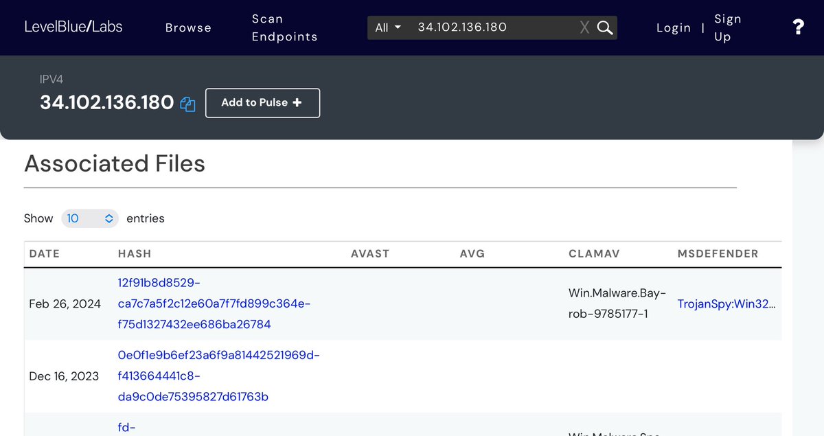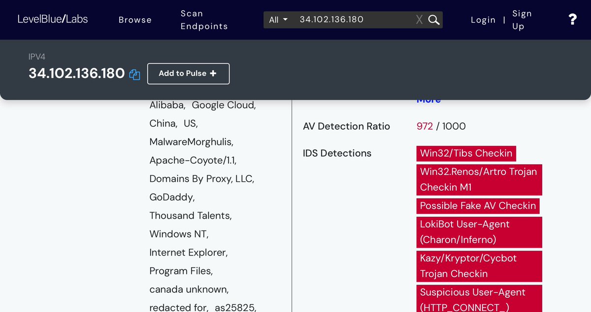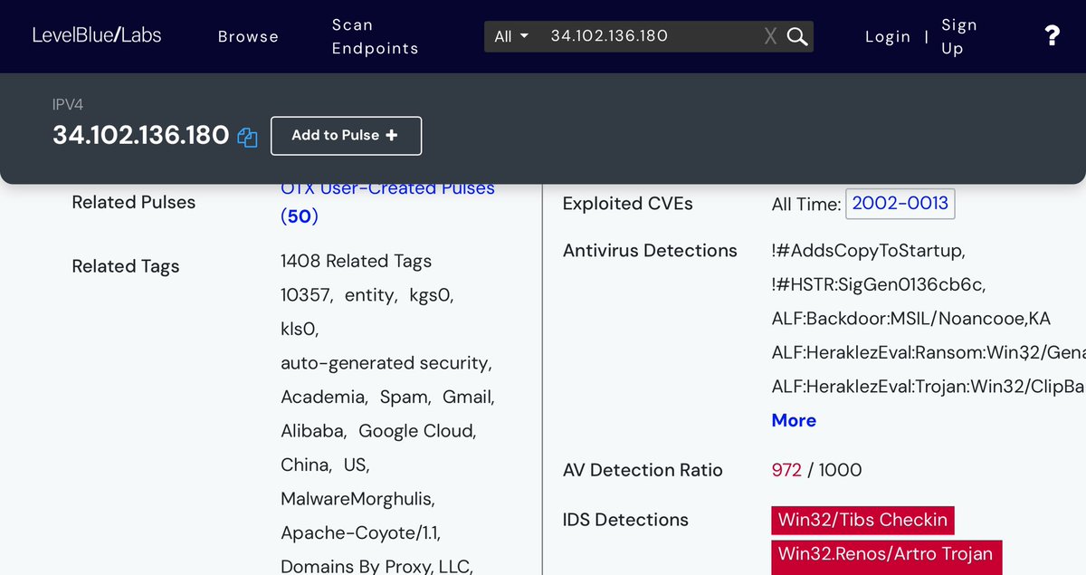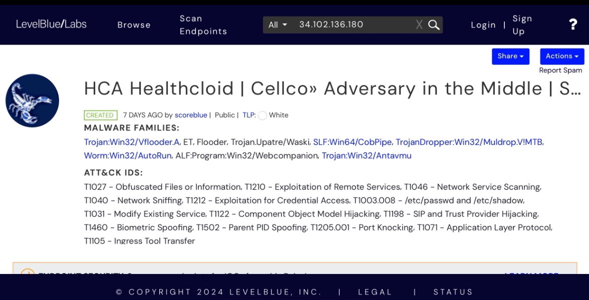HCA HEALTHCARE: This is the primary IP address being using to send malware files into critical systems within the HCA Healthcare network. ✅34.102.136.180 Obviously, 50 Pulses (IOC’s/hacks) and 10K (malicious) Files is a fucking disaster, as are the TAGS: *Academia *Alibaba (Goldman Sachs/Investor AB/SoftBank) *China/US *Gmail/Google *Malware *Apache-Coyote/1.1 *Domains By Proxy, LLC. (GoDaddy HQ) *Thousand Talents (lol China) *Windows NT *Internet Explorer *Canada unknown 💥NOTE: Because of Alibaba’s presence, I’m gonna wager the Japanese IP address contacted (included in next post) will almost certainly be affiliated with SOFTBANK, one of Alibaba’s earliest investors, alongside Goldman Sachs (Atlantic Council) and Investor AB (Wallenbergs/Atlantic Council). *What I could use some help on, fellow sleuths, is the MOST RECENT malicious file which was uploaded almost EXACTLY one year ago, February 26, 2024. 💥REQUEST: I have the “most frequent” originating (source) IP and destination IP addresses, but both are listed “IP as PRIVATE”. Was hoping someone could help me unmask those and see if and where this really comes from/through in Kansas City? ✅192.168.122.25 (top source) and ✅192.168.122.1 (top destination)