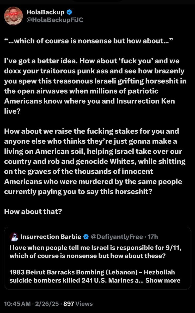 “…which of course is nonsense but how about…” I’ve got a better idea. How about ‘fuck you’ and we doxx your traitorous punk ass and see how brazenly you spew this treasonous Israeli grifting horseshit in the open airwaves when millions of patriotic Americans know where you and Insurrection Ken live? How about we raise the fucking stakes for you and anyone else who thinks they’re just gonna make a living on American soil, helping Israel take over our country and rob and genocide Whites, while shitting on the graves of the thousands of innocent Americans who were murdered by the same people currently paying you to say this horseshit? How about that?