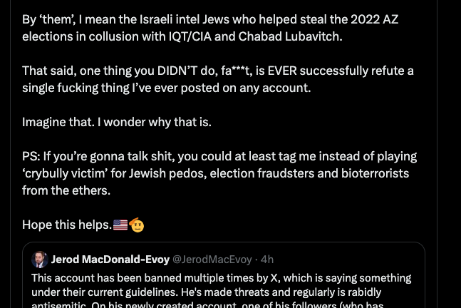 Hey, Jerod. 1. What is my banning multiple times by X saying, specifically? That Michal and Zachary, two Israeli military/intelligence assets who inconsistently enforce rules to protect Israel, don’t like my content? Or that Yoel Roth didn’t like it before them? 2. What threats have I made, Jewrod? Be exactly specific, with receipts. Thanks. 3. “…and regularly is rabidly antisemitic” Lol, who gives a shit? We don’t live in an “antisemitism = Jew criminal plot armor” America anymore. Meanwhile, your traitorous punk ass is on Soros’s payroll, you protect Jewish pedophiles and when presented with irrefutable evidence demonstrating Katie Hobbs’ and Patrick Goodman’s ties to foreign global Jewry interests, and egregious election fraud in AZ, you ran interference for them. Instead of, you know, giving a shit about being an actual fucking journalist. (Because you’re not a fucking journalist.) By ‘them’, I mean the Israeli intel Jews who helped steal the 2022 AZ elections in collusion with IQT/CIA and Chabad Lubavitch. That said, one thing you DIDN’T do, fa***t, is EVER successfully refute a single fucking thing I’ve ever posted on any account. Imagine that. I wonder why that is. PS: If you’re gonna talk shit, you could at least tag me instead of playing ‘crybully victim’ for Jewish pedos, election fraudsters and bioterrorists from the ethers. Hope this helps.🇺🇸🫡