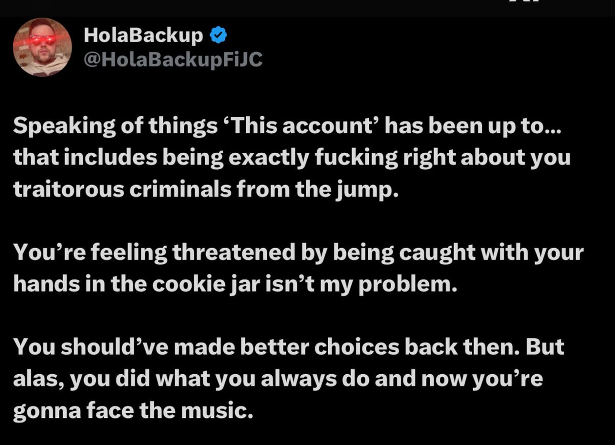 Speaking of things ‘This account’ has been up to… that includes being exactly fucking right about you traitorous criminals from the jump. You’re feeling threatened by being caught with your hands in the cookie jar isn’t my problem. You should’ve made better choices back then. But alas, you did what you always do and now you’re gonna face the music. Cope well, fa***t.✌️🇺🇸🫡