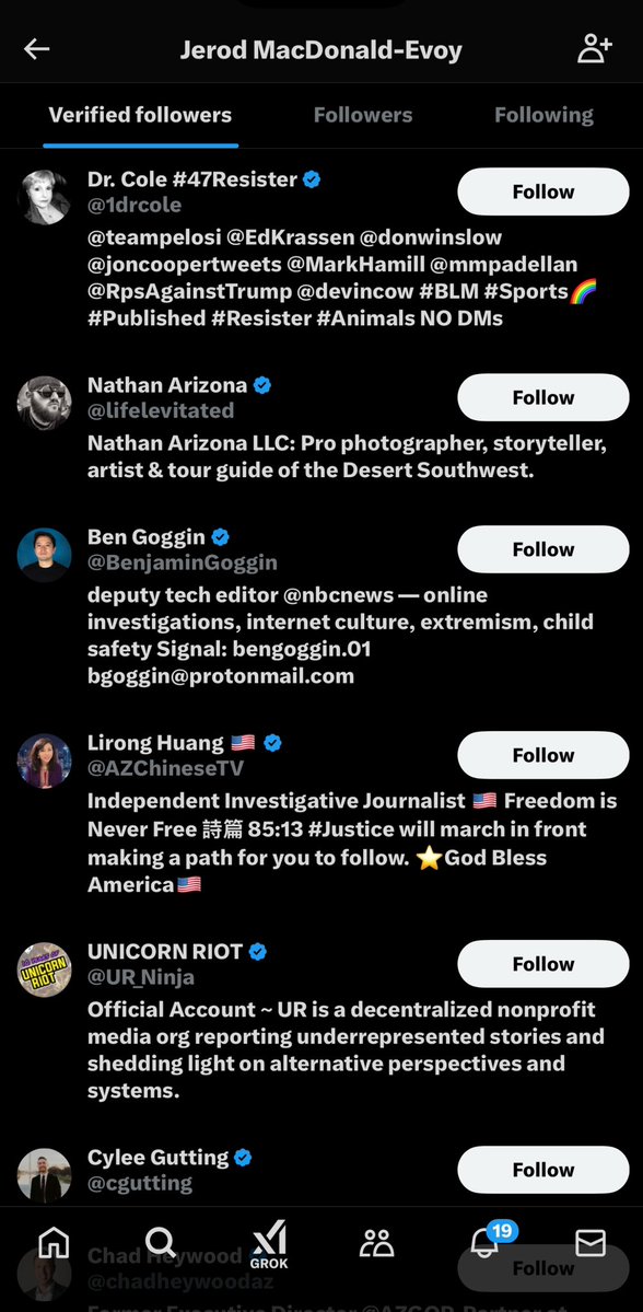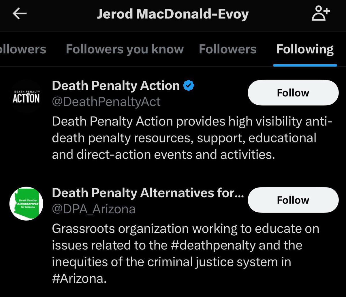 Jerod MacDonald-Evoy, the son of a “retired” 32-year USAF Intelligence Analyst who woke up this morning and chose suicide, also thought it a worthwhile endeavor to follow “Death Penalty Action” and “Death Penalty Alternatives for Arizona” for some reason. It seems he has a newly-vested interest in seeing the death penalty be abolished in Arizona, where he commits the overwhelming majority of his treason. Weird. One of his most recent “Verified Followers” happens to be UNICORN RIOT, an entity that belongs to the AMERICAN IRON FRONT consortium. AIF is chock full of known-British/Israeli/US Naval intelligence/CIA operatives and personnel, and the consortium includes established foreign operative entities such as ANTIFA, ACLU, ADL, SPLC, RAND Corp, etc. AIF was involved with the “Summer of Love” riots, the J6 entrapment operation and is strongly believed to have been linked to the 10/7 massacre of innocent Israelis as well. Imagine that, sports fans. (CAIR, which literally funds Hamas, is also sponsored by and partnered with AIF entities.)