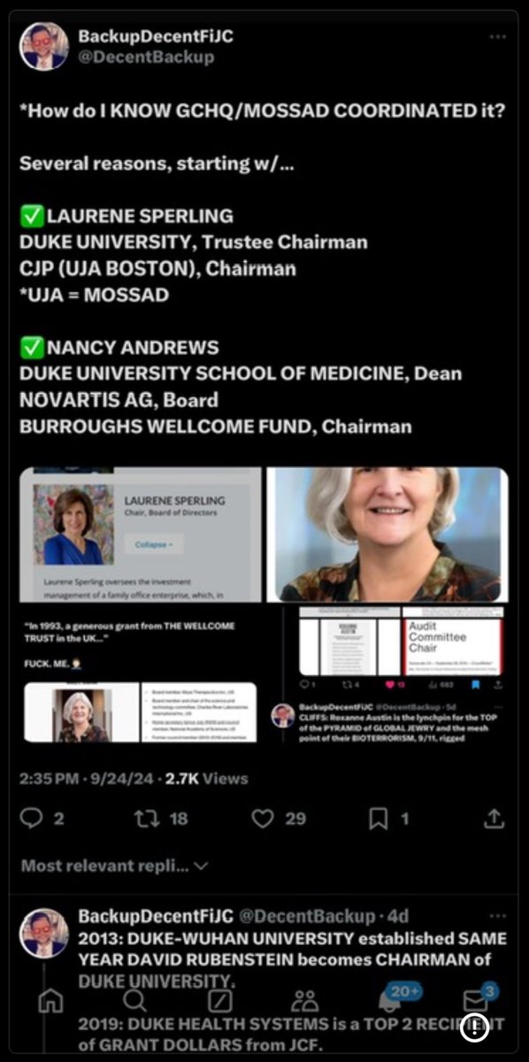 👺THE EPOCH TIMES: What do you Notice™️ about Jan here? If it’s fuzzy, I’ll gladly fill in the details for you with damn near 20 minutes worth of receipts to help out. ✅JAN “JEK-IE-LEK” JEKIELEK *THE EPOCH TIMES, Senior Editor *FINDING MANNY, Holocaust Documentary *JEK-IE-LEK: First off, I REALLY loved your “Finding Manny” Holocaust documentary! Especially the part where we find out the site (http://findingmanny.com) shares a related domain (and Port 80) with the Jewish Federations of South Palm Beach (JFSPB). JFSPB is yet another branch of JFNA and is otherwise commonly referred to as “South Palm Beach MOSSAD”. (http://jewishboca.org) 💥Because if there’s one thing we can NEVER have enough of, while Global supremacist Jews are planning (and committing) fucking genocide and biological terrorism against the White race, it’s another goddamned “Holocaust documentary”. And the fact that you filmed it with and for the “South Palm Beach Mossad” is just icing on the fucking cake as far as I’m concerned.🤦🏻♂️ *I also love how “Kennedy Center for the Performing Arts”, a.k.a. “David Rubenstein (Kennedy Center Chairman)”, is showing up as your first follower. *I love how fucking Chinese and Jewish The Epoch Times turned out to be. And that its CFO was just indicted last year (June 2024) for “allegedly” laundering damn near $67 million fucking dollars, much of which through… *drumroll*… cryptocurrency. *I also loved to discover that between 2012-2016, The Epoch Times received at least $900,000 from Renaissance Technologies. Renaissance is led by CEO Peter Fitzhugh Brown, who is often better referred to as the husband of former FDA Director, Margaret A. Hamburg. *I also love that Margaret A. Hamburg is part of Nuclear Threat Initiative with Lucia Borio from IQT (CIA) & ARCH Venture Partners, Gideon Frank, Director General of Israeli Atomic Energy Commission, Reshma Shetty, Founder & CEO of Ginkgo Bioworks (CIA/Baillie Gifford/Unit 8200/GCHQ) and Jeremy Konyndyk. *I REALLY loved how Margaret Hamburg was part of that NTI Munich Security Conference in 2021, alongside Jeremy Farrar (Wellcome), Chris Elias (B&MGF, Population Council, Event 201), George Gao (CDC China) and tons of other fun people from NTI and Tsinghua University, just like the President of The Epoch Times’s Seattle (Bellevue, WA) Branch, Echo Liu. *But more than that, I loved how Margaret Hamburg was on Covid investigative committees alongside Peter Daszak, Kristian Andersen, Gigi Gronvall, Ralph Baric, etc. *And last but not least, I LOVED that between 2019-2021, The Epoch Times experienced a 685% INCREASE IN REVENUES, reaching as much as $122 million in 2021!🤯 ✅ECHO LIU *THE EPOCH TIMES, President & Publisher, Seattle Branch (Bellevue, WA) *TSINGHUA UNIVERSITY, Freelance Editor & Writer DUKE KUNSHAN & DUKE ENERGY: *Turns out, G. Richard Wagoner Jr is the missing link between COVID & FEMA/NC/Helene terrorism. ✅G. RICHARD WAGONER JR. *DUKE KUNSHAN UNIVERSITY (Wuhan, China), Chairman of the Advisory Board *DUKE ENERGY INITIATIVE TASK FORCE (EITF) *DUKE UNIVERSITY, Trustee Emeritus *DUKE UNIVERSITY HEALTH SYSTEM, Director *GENERAL MOTORS (GM), Chairman & CEO ✅DAVID RUBENSTEIN *DUKE KUNSHAN UNIVERSITY, Advisory Board *DUKE UNIVERSITY, Trustees (fmr Chairman) *DUKE CAPITAL PARTNERS, Executive Committee *KENNEDY CENTER FOR THE ARTS, Chairman *TSINGHUA UNIVERSITY, Advisory Board *COUNCIL ON FOREIGN RELATIONS, Chairman *CARLYLE GROUP, Co-Founder & Co-Chair ✅JULIA MAYFIELD *DUKE ENERGY INITIATIVE TASK FORCE (EITF) *NORTH CAROLINA, Senator *ACLU (Mossad), WNC Chapter ✅LAURENE SPERLING *DUKE KUNSHAN UNIVERSITY, Advisory Board *DUKE UNIVERSITY, Chairman of Trustees Board *COMBINED JEWISH PHILANTHROPIES (Boston JFNA/UJA/Mossad), Chairman ✅SCOTT SPERLING *THERMO FISHER (PCR Tests, Temasek/Singapore), Lead Director *LAURENE SPERLING, Husband ✅NANCY ANDREWS *DUKE UNIVERSITY MED SCHOOL, Dean *WELLCOME BURROUGHS, Chairman *NOVARTIS AG, Board *NIH, Senior Advisor