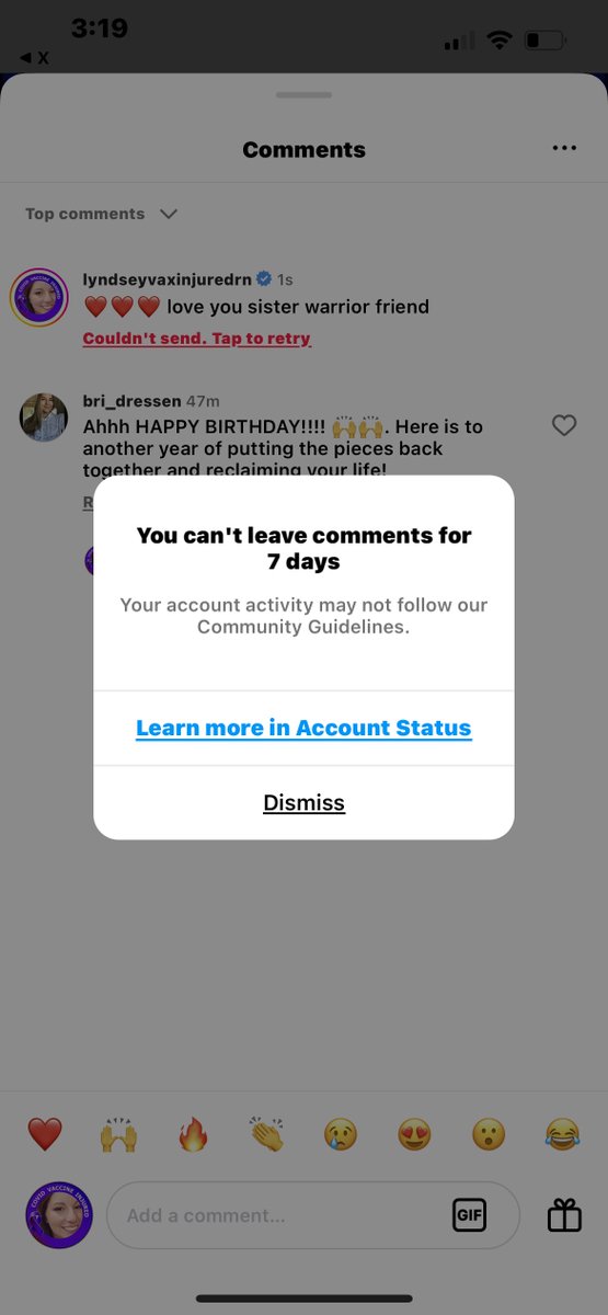 And the F’Ing Censorship Continues of the Vax Injured! This time on Meta! @CharlesRixey I was responding to a happy birthday reply from my birthday and transformation post with @BrianneDressen and they banned my account for 7 days bc I posted my own injury pictures of my progression and also bc let’s be honest they have @BrianneDressen marked still bc she was one of the ones they were monitoring and censoring from the infamous Virality Project exposed by the twitter files. I hadn’t come into the scene yet so I’m not in that project but I am marked today and this proves it. That makes 1 90 day restriction on FB, 2 banned TikTok accounts, and now this Insta Blockage. You can’t tell me this isn’t targeted harassment or bordering on hate crimes then I Dont know what is. Thanks for the restriction bc it just got added to future censorship lawsuits and your name is officially on the list with many others✊ WAKE UP PEOPLE! They Dont want YOU to know the TRUTH! FOLLOW THE SILENCED. Those are the people you want to follow! #VaxInjuries #VaxDeaths @BrianneDressen @NikkiAnne2016 @rgvrunner01 @JSutta @TrinnaHerron @Michell87463246 @DrewOutstanding @thecoercednurse