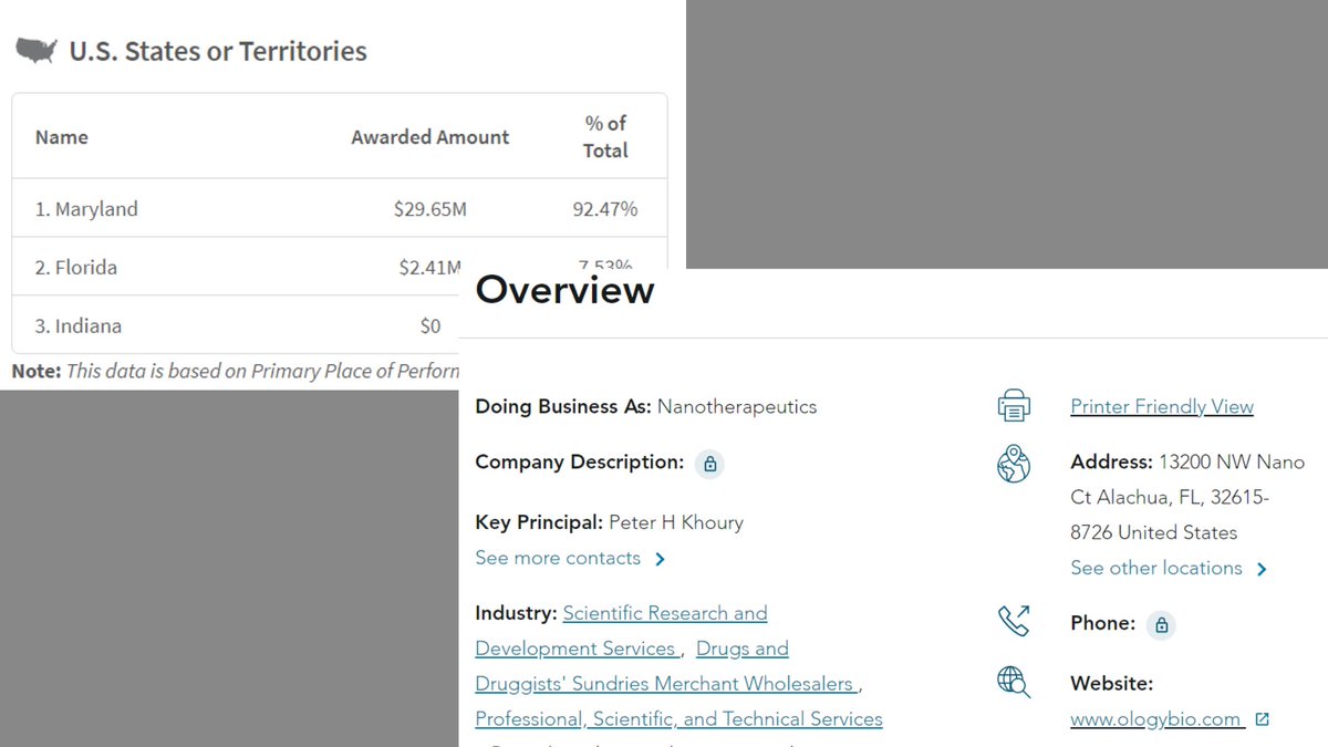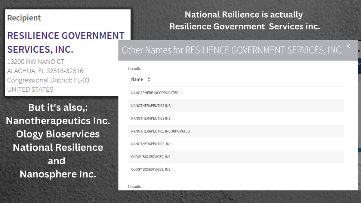 4/10 🧵 Now, usaspending claims that Resilience is actually named multiple entities: Nanotherapeutics, Nanosphere Inc, Ology Bioservices, and Government Resilience Services. Each entity having a vivid background.