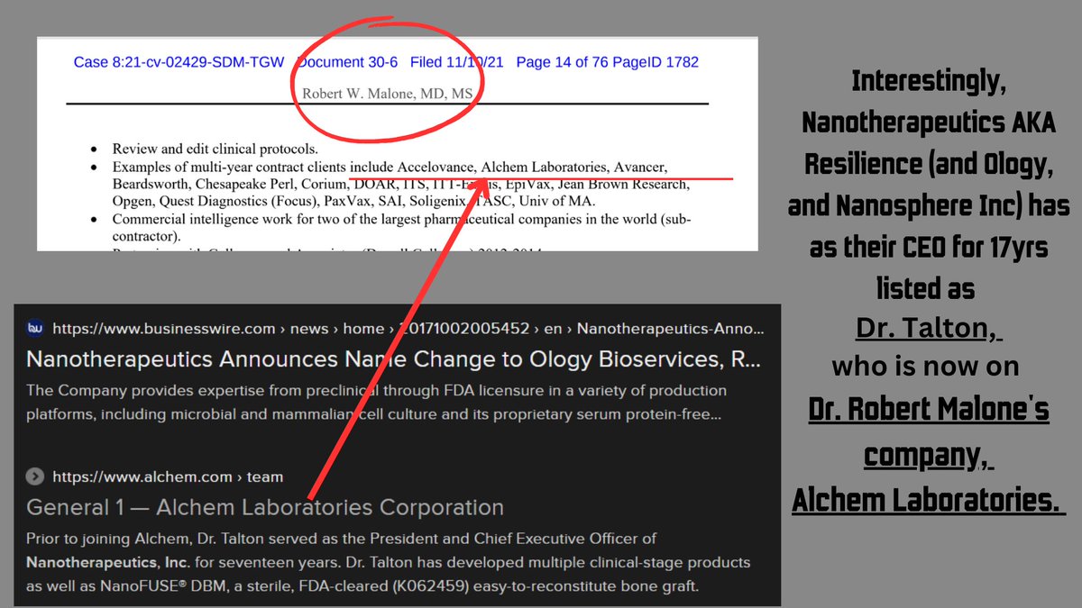 6/10 🧵 Also listed as investors is Google, Lux Capital, Magnetic Ventures. The COO for resilience was also a Senior advisor for rival Pfizer. Nanotherapeutics/Resilience's CEO of 17yrs now runs Alchem, Dr. Robert Malone's company.
