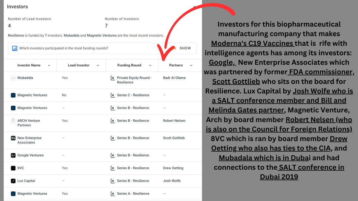 1/10 Back in fall of 2021, Moderna hired and tasked a supposedly new pharmaceutical manufacturing company called National Resilience (Resilience) to make ALL of their Covid-19 vaccines . Resilience is rife with conflict of interest esp. with the intelligence community.