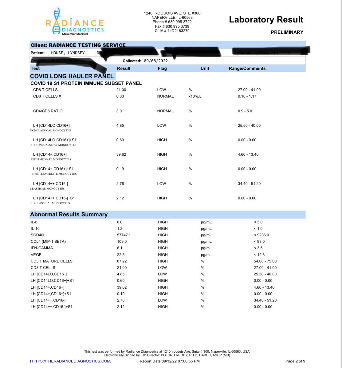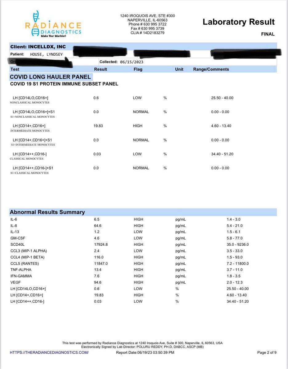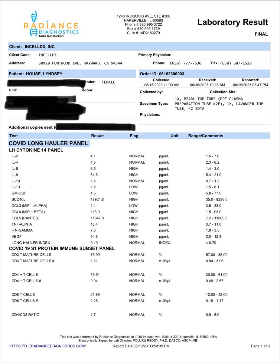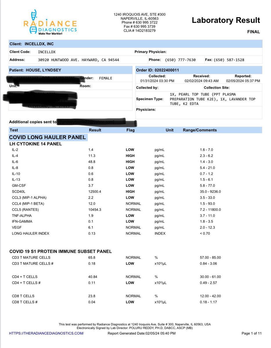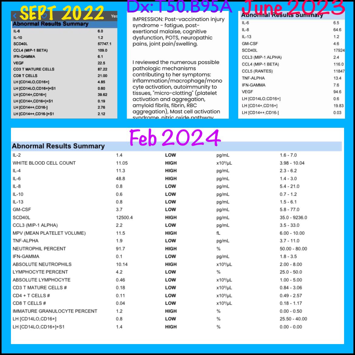 So the Yale Listen Study said 709 days per their testing of vaxinjured still having continuous spike production (which I am a participant in this study) and show T cell exhaustion etc Well it’s actually longer than that: My first injection was 12/23/2020 and I haven’t stopped producing spike and it’s now 02/21/2025 8 months after my 2 Moderna injections I still had large amounts of spike detected per antigen testing- & I’ve never had Covid( results below) That’s 1,521 days - of continuous spike protein production with NO OFF SWITCH since my first injection & STILL in my body to date Let that sink in! (3 years worth of Cytokine 14 panels & S1 immune subset panels below) I am a documented, confirmed & diagnoses Adverse reaction to MRNA vaccine ( T50.B95A)