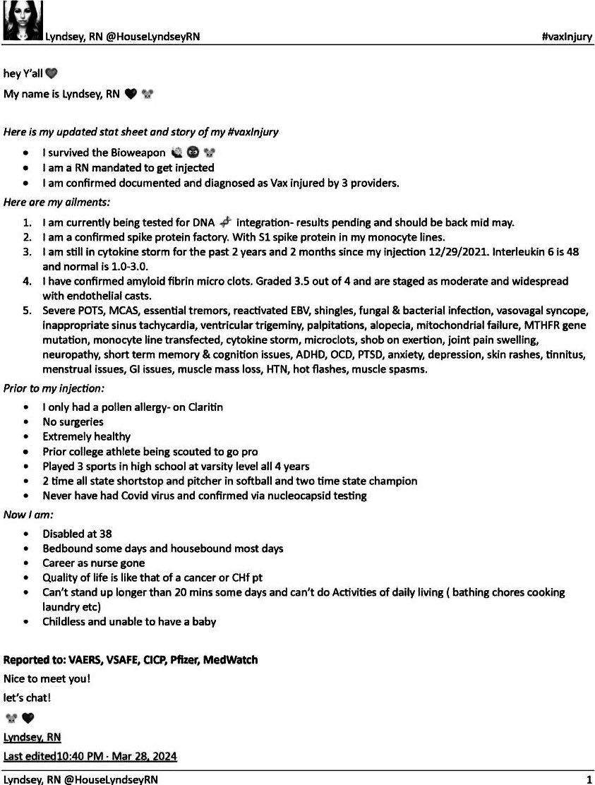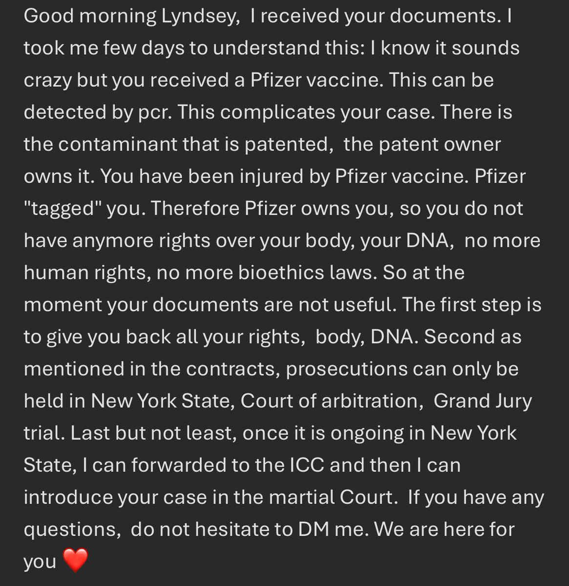 •Hey y’all! 🤙👋💜😘 • Allow me to introduce myself 🙏💜🐭 : I am Lyndsey House, RN- I am a Registered Nurse whom was mandated to get injected in order to keep my job. •I was severely injured by my Pfizer jab and I am documented, diagnosed and confirmed vaxinjured and is all over my medical charts •i will post my updated stat sheet below: 👇 •As a Registered Nurse, I am a living testament to the adverse effects of the mRNA COVID-19 vaccines. My personal experience is not an isolated case but part of a growing number of reported deaths, disabilities, and injuries associated with these vaccines. Mandated by my employer and coerced by the government, I was left with no choice but to take the injection. The aftermath? A life-altering injury that has been ignored by those who enforced this mandate. The mRNA gene therapy platform used in these vaccines has been confirmed to integrate into our genome through testing. This alarming fact raises serious concerns about long-term health implications that we may not fully understand yet. Furthermore, it's evident that there's a lack of informed consent regarding these potential risks. The current situation is nothing short than a violation of our human rights – we are receiving an adulterated product under false pretenses which could potentially alter our genetic makeup irreversibly. Our plea is straightforward: BAN the entire mRNA gene therapy platform and take the COVID-19 vaccines off the market for further investigation due to their confirmed status as adulterated products violating human rights. We owe it to ourselves and future generations to ensure safety before widespread use. We cannot afford more lives lost or permanently altered due to rushed decisions without comprehensive understanding or transparency about potential risks involved. Stand with us in demanding immediate action on this critical issue 👇👇 •Sign global petition here: ( any country can sign ) 👇👇 https://www.change.org/p/demand-immediate-ban-and-investigation-of-mrna-covid-19-vaccines •I am currently being researched for DNA/RNA INTEGRATION INTO MY GENOME 🧬 -> 👇 https://jessicar.substack.com/p/dna-found-integrated-in-cancer-cell?utm_source=substack&utm_campaign=post_embed&utm_medium=web •my goal is to stop the covid vax and have it investigated because it is not safe and effective and vaxinjuries are unfortunately not rare😭 and save the children •thank you for any donations you send and the prayers and sharing of my fundraiser Godspeed my friends 💜👌🏻 •my substack : 👇 substack.com/@lyndseyhousern •My dogecoin dogecoin: Do Only Good Everyday: 👇 https://mydoge.com/LyndseyRNdoge •My cash app: 👇 https://cash.app/$lyndseyhouseRN •My Venmo : 👇 https://cash.app/$lyndseyhouseRN •Vaxinjured lounge shop: 👇 my-store-eba1c1.creator-spring.com/listing/pants-… •Locals : 👇 https://thevaxinjuredlounge.locals.com/upost/4352866/welcome-everyone-to-the-vaxinjured-lounge •VaxInjured Lounge Community : click on community tab in my bio and answer questions to join: 👇 •MY STORY AND RESOURCES DIARY OF MY VAXINJURY- 👇 https://givesendgo.com/G9XSJ My Linktree: Diary and Holy Grail 👇 https://linktr.ee/lyndseyhouseRN Bookmark and share 💜👌🏻 #VaxInjuries #VacDeaths