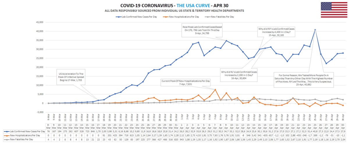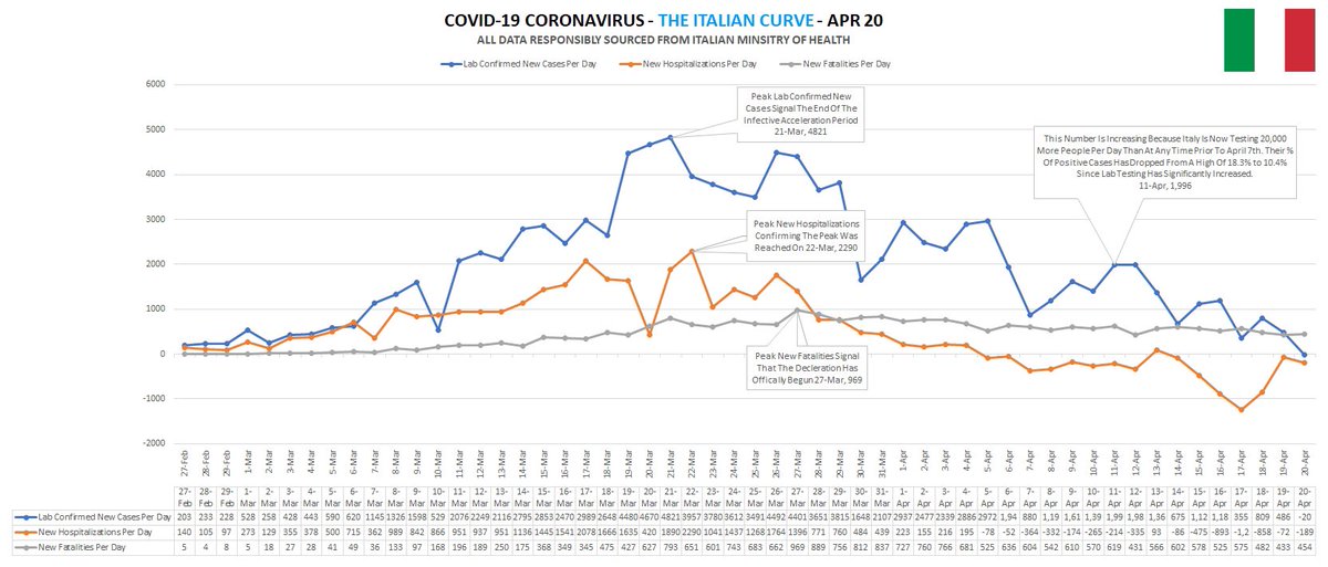 @P_McCulloughMD @DrJBhattacharya @JohnBeaudoinSr Here's Italy's New Cases, New Hospitalizations, New Deaths by day. Notice a much smaller area between the top line (New Cases) and the middle line (New Hospitalizations)... this is how all other countries were looking... but not the US... Why?