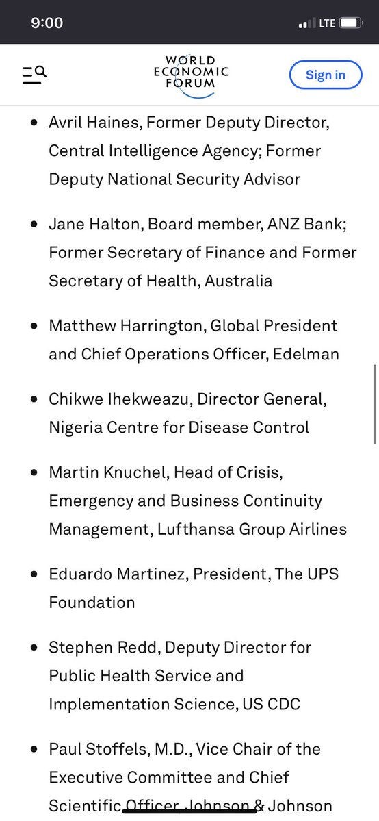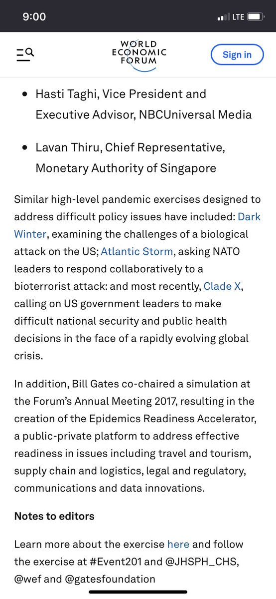 @P_McCulloughMD At Event 201 you have... The World Bank WEF CIA US CDC Chinese CDC Nigeria CDC UN UPS Hotel Rep Airline Rep Harmaceutical Industry & J&J who made one of the shots... And Bill Gates https://www.weforum.org/press/2019/10/live-simulation-exercise-to-prepare-public-and-private-leaders-for-pandemic-response/
