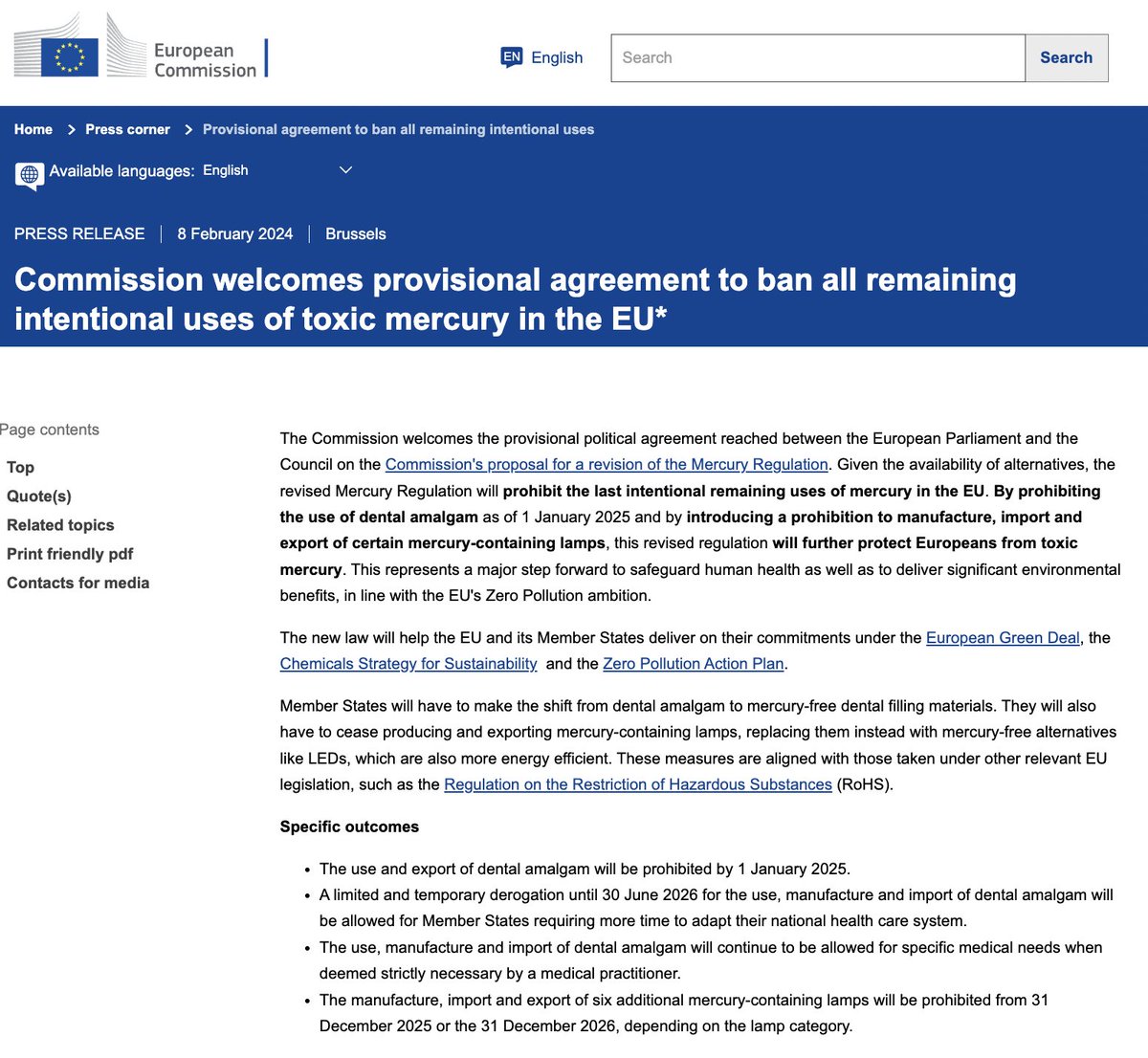 MEDIA SILENCE. New PRESS RELEASE. THE EUROPEAN PARLIAMENT and the European Council reach an "agreement to ban all remaining intentional uses of toxic mercury in the EU [to] further protect Europeans from toxic mercury". "European Parliament and the Council on the Commission's proposal for a revision of the Mercury Regulation. Given the availability of alternatives, the revised Mercury Regulation will prohibit the last intentional remaining uses of mercury in the EU. By prohibiting the use of dental amalgam as of 1 January 2025 and by introducing a prohibition to manufacture, import and export of certain mercury-containing lamps, this revised regulation will further protect Europeans from toxic mercury". Source: European Commission - 8th February 2024.