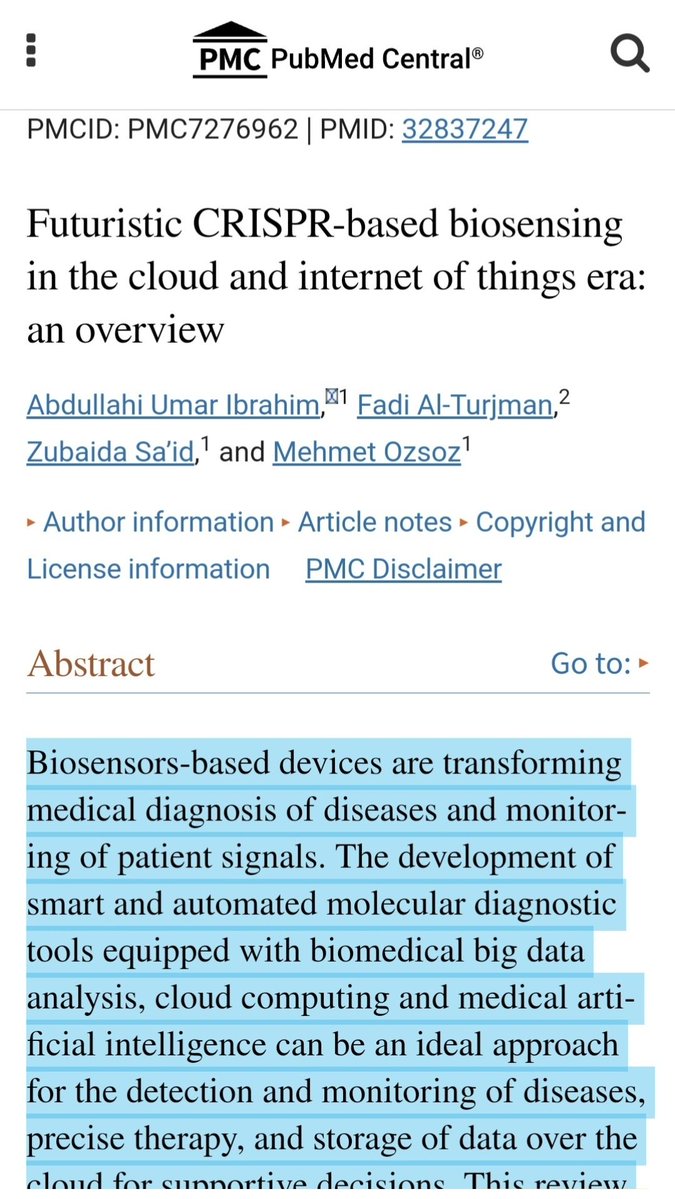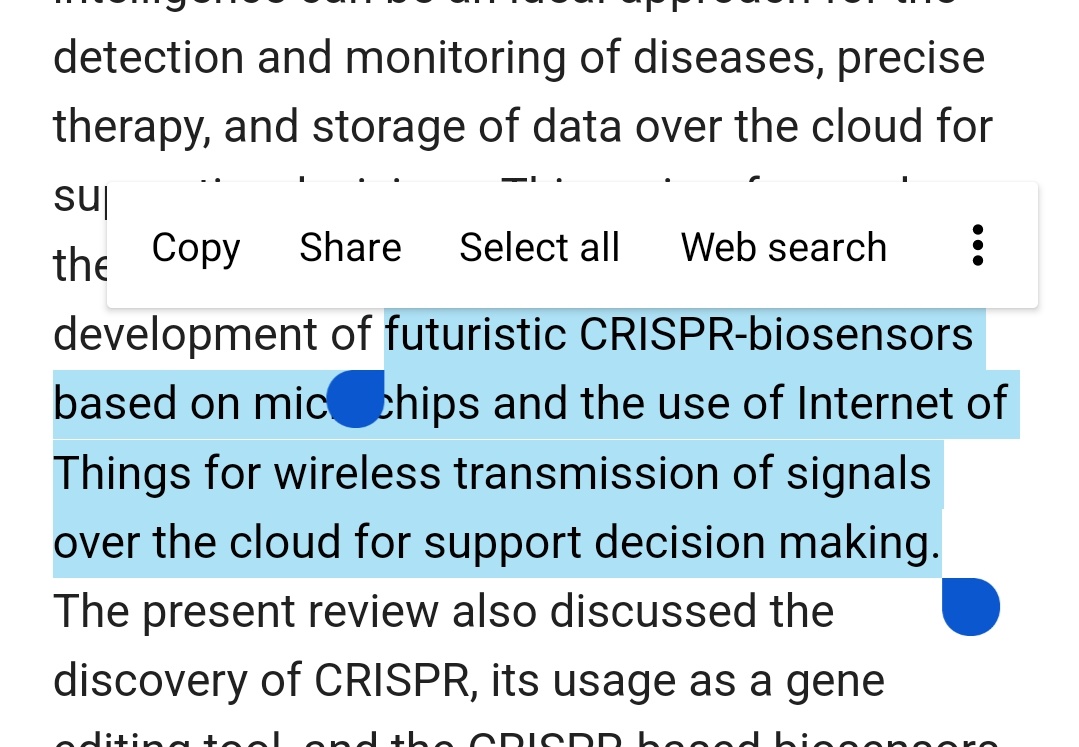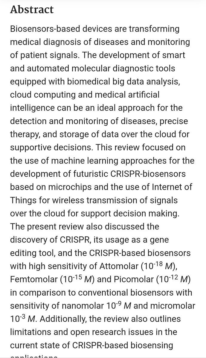 Futuristic CRISPR-based biosensing in the cloud and internet of things era: an overview https://pubmed.ncbi.nlm.nih.gov/32837247/ futuristic CRISPR-biosensors based on microchips and the use of Internet of Things for wireless transmission of signals over the cloud for support decision making.