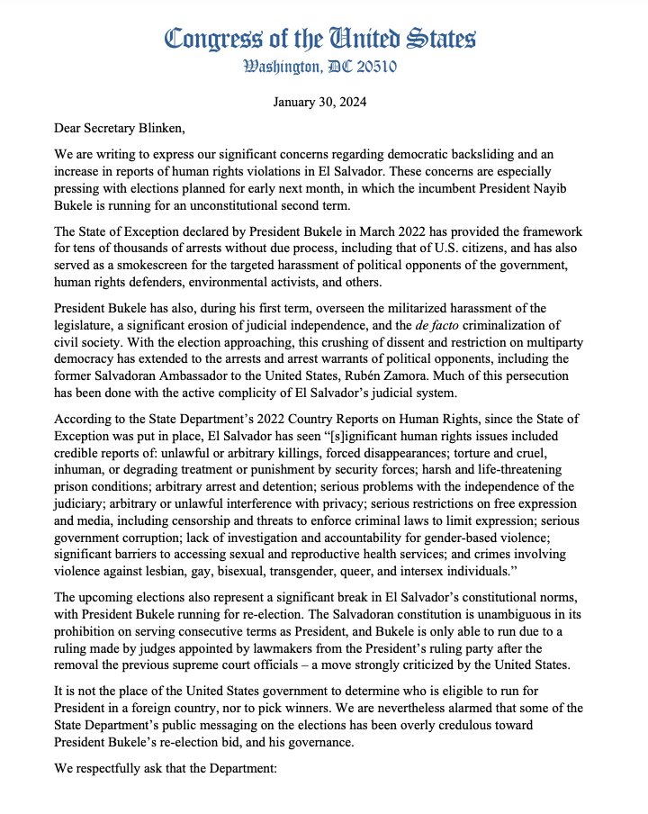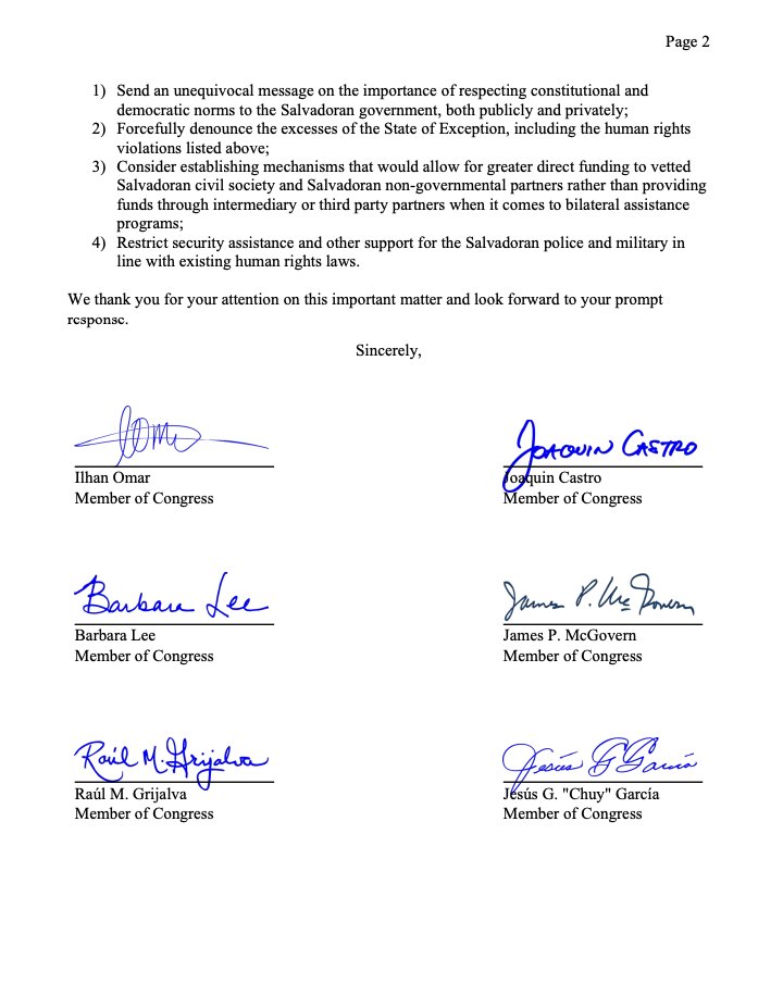 I led Members of Congress in sending a letter to @SecBlinken urging action on threats to democracy in El Salvador. The State Dept must review its relationship with El Salvador and defend democratic values. The Salvadoran people deserve free and fair elections without fear of repression. https://omar.house.gov/media/press-releases/rep-ilhan-omar-and-members-congress-call-biden-administration-address-human