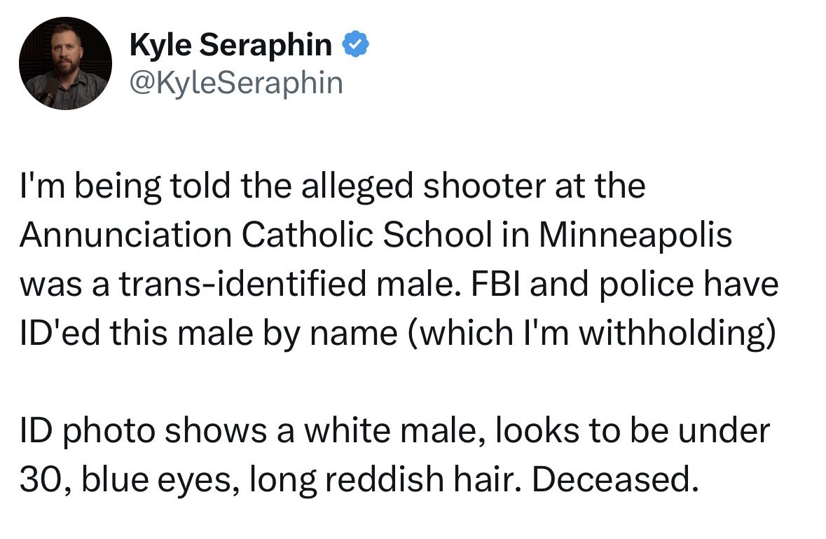 BREAKING: Former FBI agent Kyle Seraphin says his sources have identified the Minneapolis Catholic school shooter as a transgender individual under 30, whose ID lists them as a white male. https://t.co/yi8VnMMGoP
