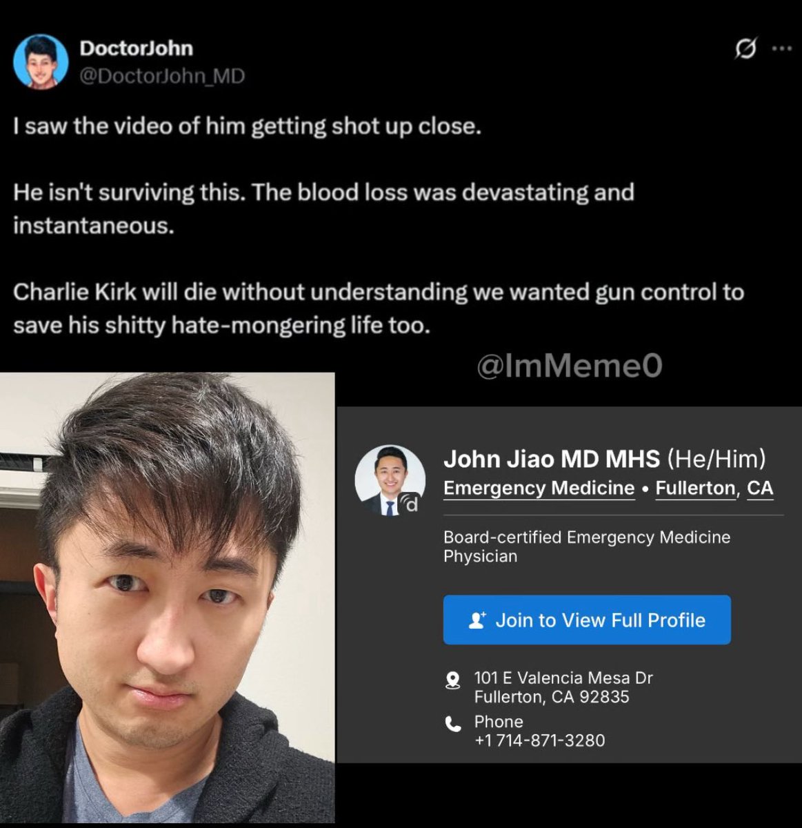 Meet Dr. John Jiao, currently practicing at St. Jude Medical Center in Fullerton, California. Following the assassination of Charlie Kirk, Dr. Jiao went on an unhinged rant, claiming that gun control could have saved what he called Charlie’s “shitty, hate-mongering life.” It’s deeply concerning when a physician shows such emotional instability and open hostility toward those who disagree with his radical political views. Would you expect fair and unbiased care from someone like that?