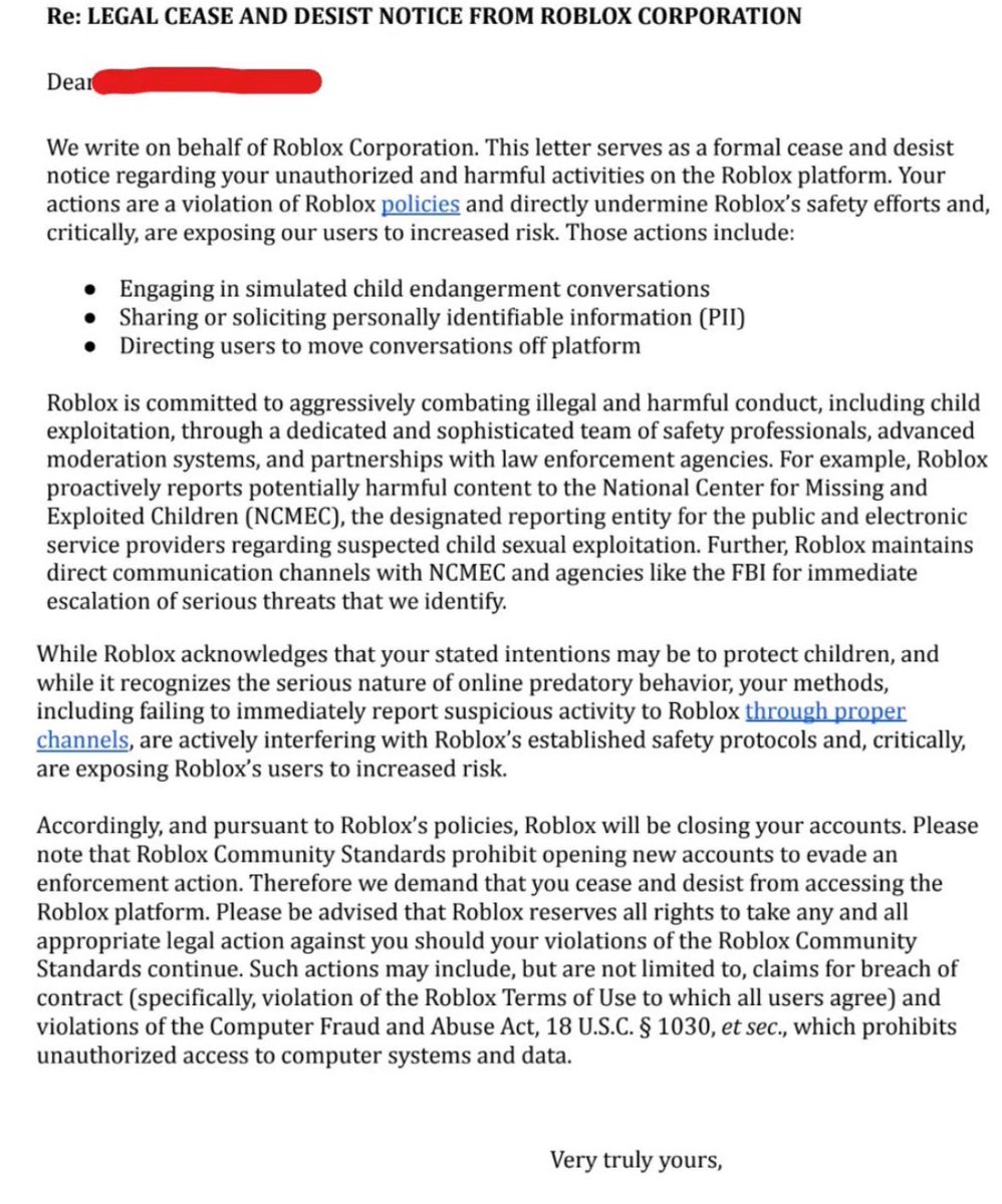 🚨 🚨 BREAKING: Popular Roblox player and YouTuber has been banned from the game after receiving a cease-and-desist from the billion-dollar company — all because he and his team exposed child predators on the platform. 1/11 https://t.co/gAe4Cqia8e