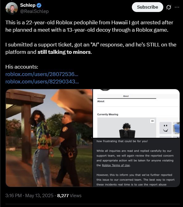 But it gets even more shocking. After recovering, Michael chose to stay on the platform because he had made genuine friends. But after years of playing, he discovered that child predators were still rampant on Roblox. So, he took matters into his own hands — launching a personal crusade to expose them. At one point, he even offered his help directly to Roblox to keep kids safe. Not only did the company ignore him — CEO David Baszucki blocked him on X. Now, Roblox has officially labeled vigilante groups like his a “platform risk” and warned that anyone involved could have their accounts banned — calling their efforts “harmful to others.” 4/11