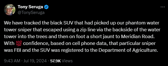 🚨#BREAKING SNIPER Seen using ZIPLINE Off the Water Tower! (Updates) -IF True THIS is going to blow the entire Trump Butler Rally Shooting completely open! -A SNIPER was seen on the tower and used a ZIP-LINE to escape back into the trees where an SUV registered to the Department of Agriculture. -We have been telling EVERYONE about this water Tower since second 1! #WaterTower #ButlerFarms #Trump
