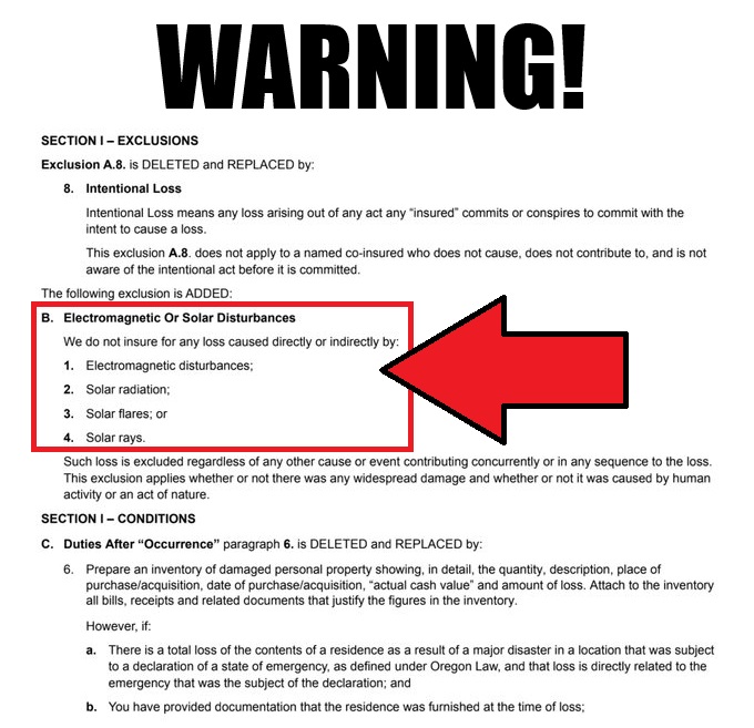🚨#BREAKING! HOME Insurance Policies are now saying they will NOT cover SOLAR DISTURBANCES! Posted by SunWeatherman. 🤯 "ANYONE who has a recently renewed/updated/changed home insurance policy... do you have this solar/EMP wording added to your policy?" This means WHEN, not IF a solar flare hits and wipes out the power grid like it did during the Carrington Event, We will ALL be screwed!
