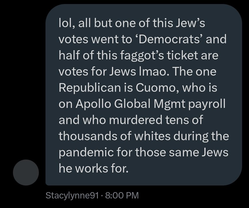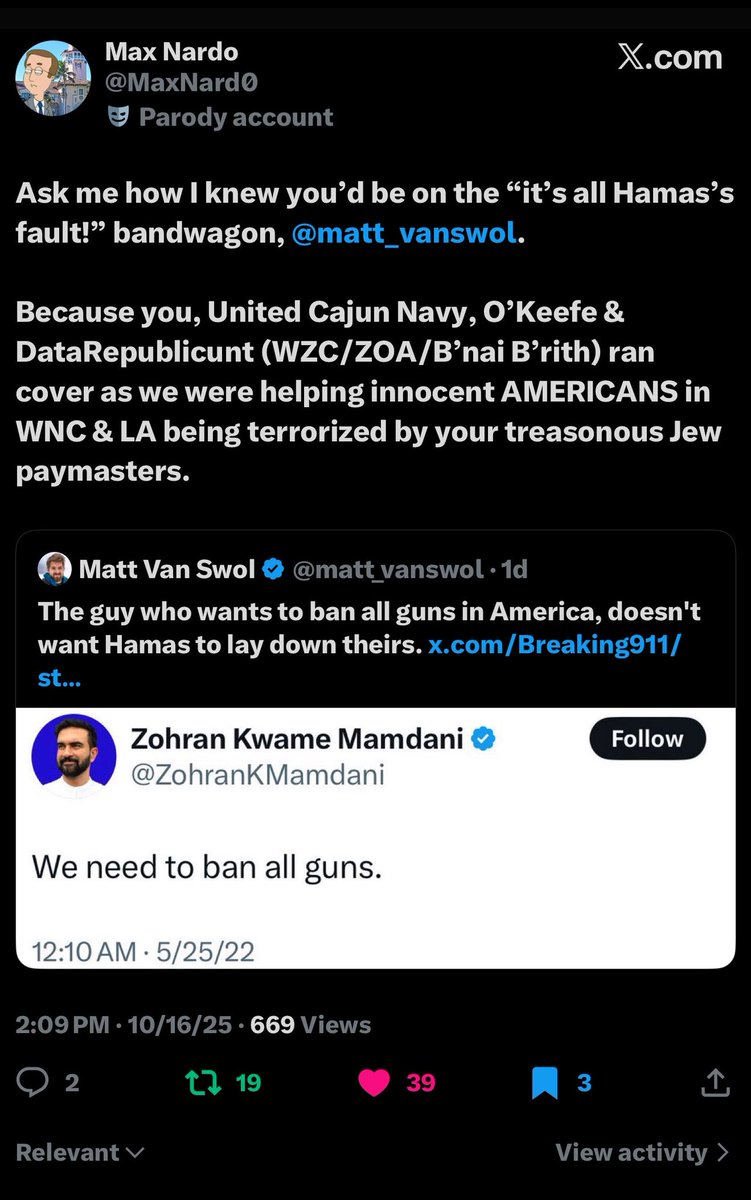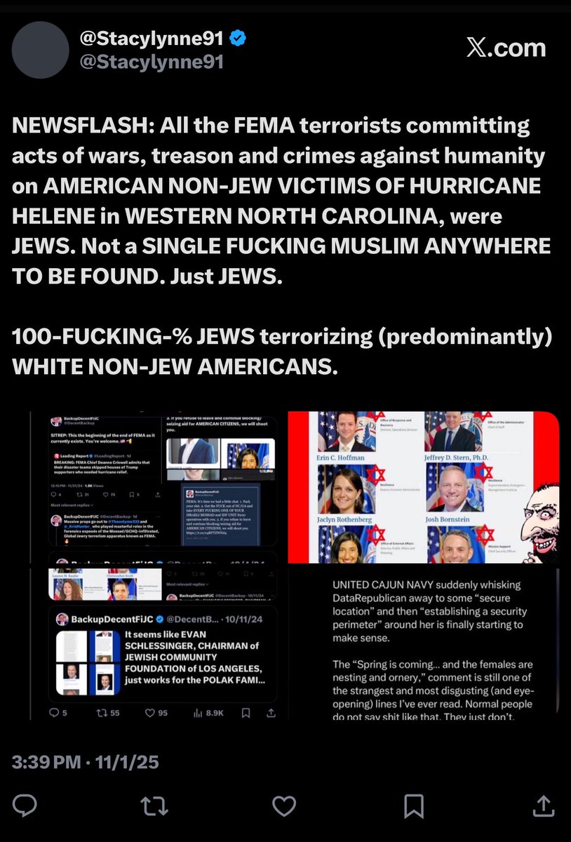 Listen the fuck up, traitors… PSA: All you ‘pardoned J6’er’ crypto jews from the Flynn/Chabad network can go right ahead and fuck ALL the way off too. I’ll be DAMNED if you’re gonna use the murder of Charlie Kirk (by Israel/jewry) as marketing propaganda to push your ‘RaDiCaL iSlAm is the greatest threat to America’ jewslop. Those days are long fucking over. As are the days of playing ‘DeMoCrAtS/RePuBlIcAnS’ or ‘LeFt/RiGhT’ or ‘LiBeRaL/CoNsErVaTiVe’. Charlie Kirk was a White Christian American who’d spent much of his life pushing zio goyslop for a B’nai B’rith/Israeli intelligence front called TPUSA, whether he knew it the whole time or not. But in the last few months of his life, he’d (correctly) turned on Israel, Netanyahu and all the treasonous jews in America (especially the billionaires) who USE America to serve Israel/global jewry interests ONLY, to the DETRIMENT of America and the American people. What’s more, he’d finally become AMERICA FIRST. *And before the harpies chime in, let me just say, even if it’s all THEATER and Charlie Kirk is NOT REALLY DEAD, just the ‘theater’ of his death still attempts to send the SAME FUCKING MESSAGE to tens of millions of ANGRY PATRIOTIC NON-JEW AMERICANS… “We (Israel/jewry) WILL kill/neutralize anyone who gets outta line or in the way of our deranged zio/bolshevik jew supremacy agenda.” …and I ain’t gonna fucking allow you to have it. Prepare your fucking cope accordingly.🖕 NOTE: I thought it was super fucking clever (revolting) of the @mattvanswol fgt from the U.S. Department of Energy (who also does ‘marketing’ for UnitedHealth [AIG], Apple, Hilton Hotels and the ‘LGBTQ CoMmUnItY’) to jewishly cite CHARLIE KIRK’S OWN TWEET that said… “No, radical Islam kills.” …and then add his own cunty little “Charlie was right.” caption in the wake of the recent shooting of our National Guard soldiers in Washington DC (by some DoD/State Dept/Soros-tied Afghan operative). The problem with THAT is Matt Van Swol is attempting to posthumously rewrite Charlie Kirk’s own words (and beliefs), for the benefit of the SAME FUCKING ISRAELI-LOYAL JEW SUPREMACISTS WHO KILLED HIM, barely 2.5 months after they took him out for souring on Israel and fully ending his support for the deranged Zionist cause. That’s precisely why Matt Van Swol deliberately cropped out the DATE AND TIME STAMP of Charlie Kirk’s ‘RaDiCaL iSlAm’ tweet, because it’d be WAY too fucking obvious to EVERYBODY what that subversive little cunt was doing. *Charlie Kirk made that tweet on JUNE 26, 2016, ALMOST AN ENTIRE FUCKING DECADE AGO, BEFORE DJT HAD BEEN ELECTED PRESIDENT THE FIRST TIME.* Get the fuck out of our country before you can’t. PS: Your ass is still grass from Hurricane Helene, fam. We’ve unfinished business in Asheville.✌️