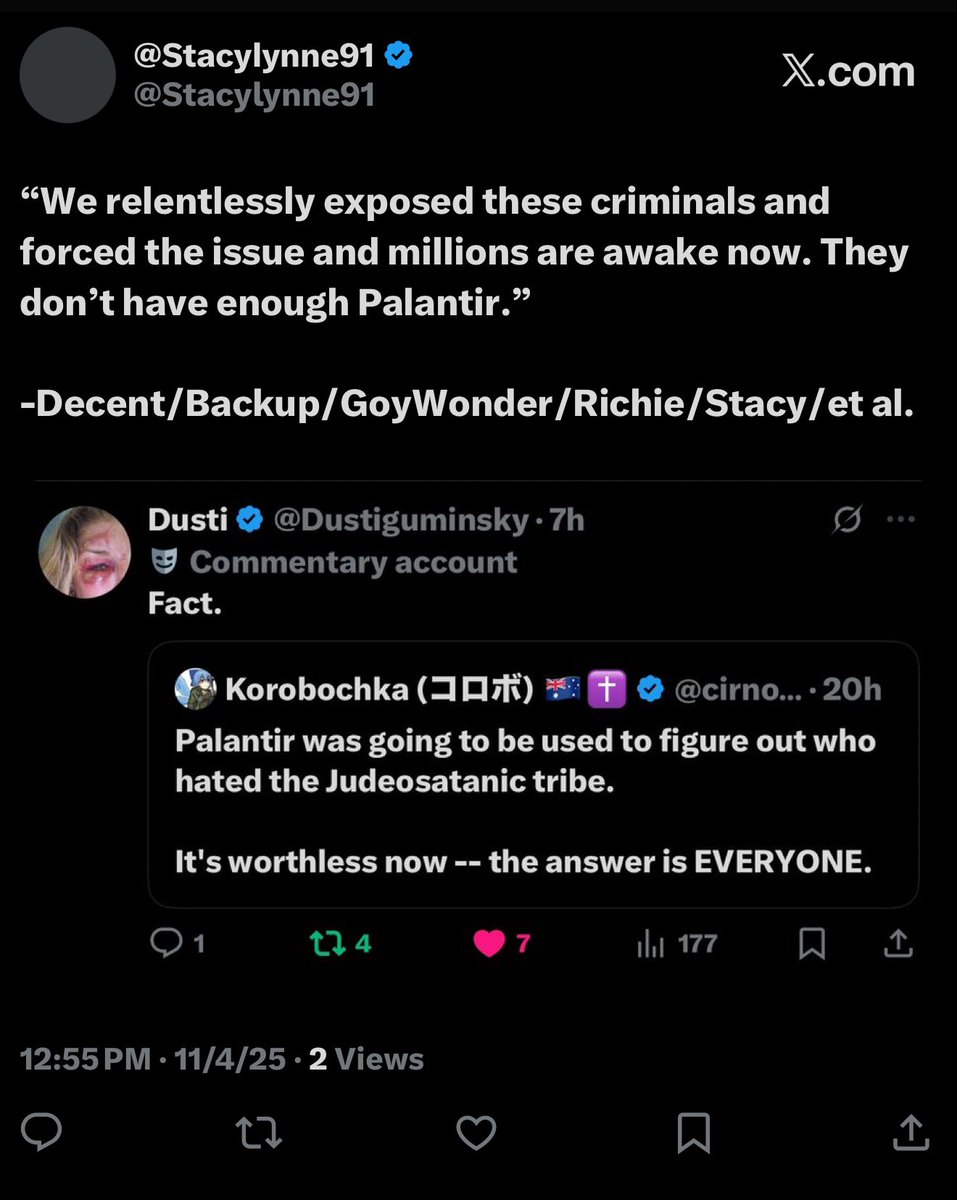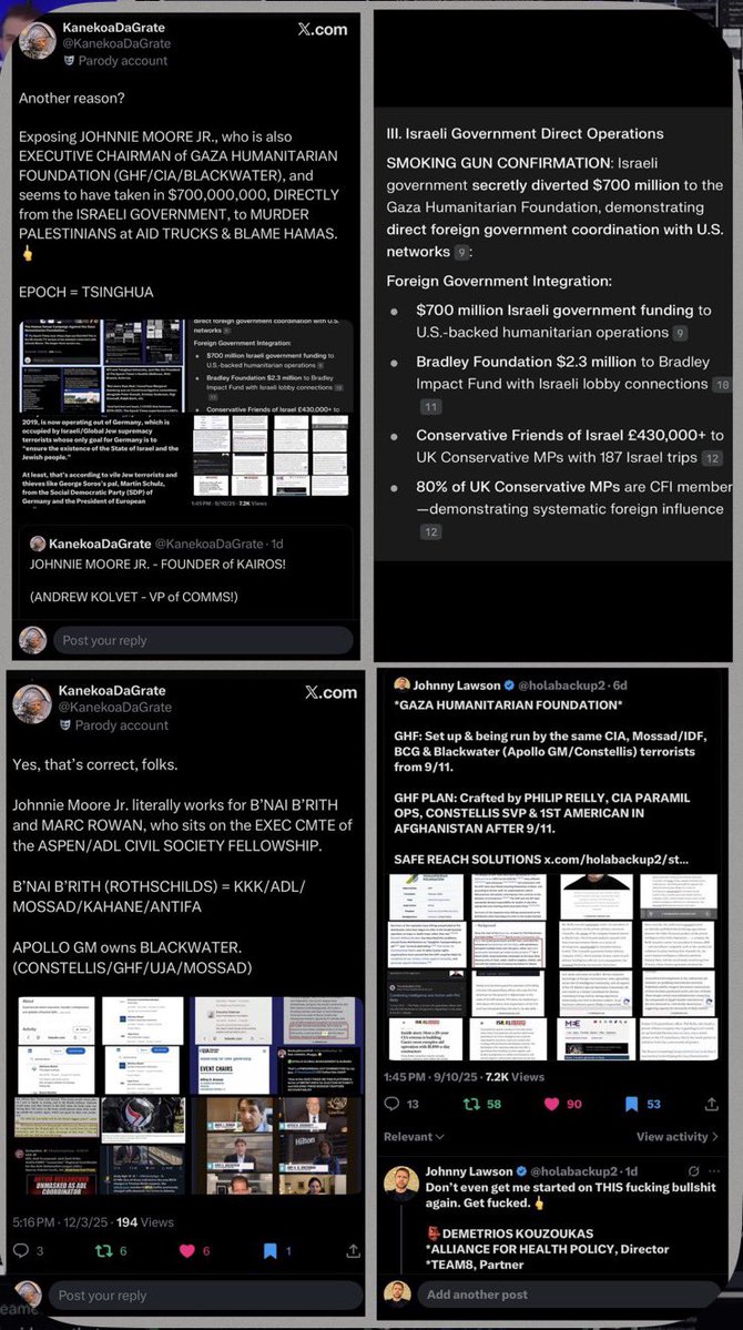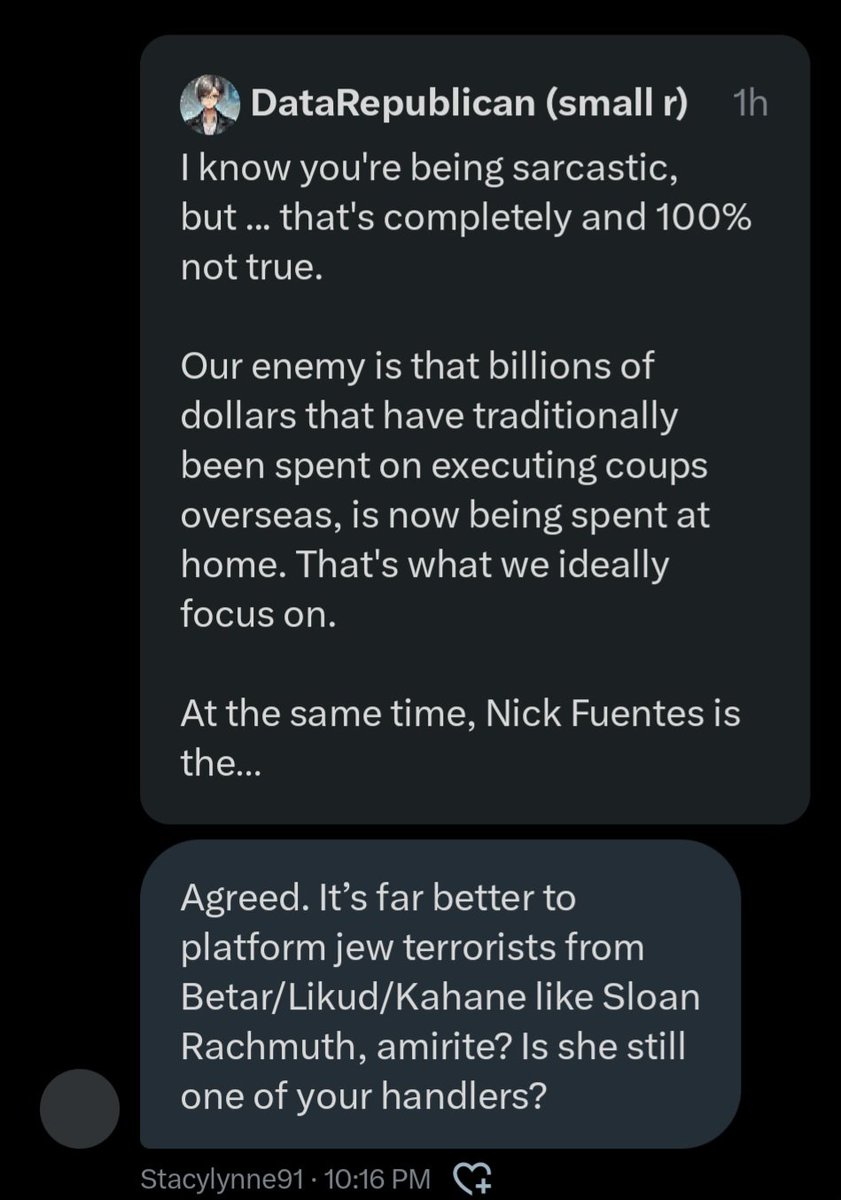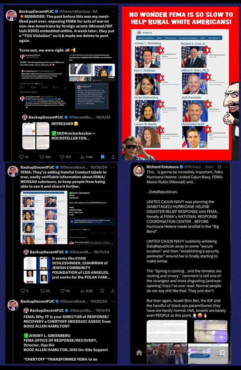 Now that my 12-hour timeout is over, we’ll address some key housekeeping (gatekeeping) items… 1. My name is Jonathan. It’s not Johnny or Richard or Ricardo or ‘whatever it is’. And you already knew that. Madz. 2. They targeted me first as part of a much larger and internationally-organized informational influence and gatekeeping operation. Choosing to fuck with me was THEIR royal fuck up. Not mine. Many have done so in the past and found out just like they will. 3. What list is that? Is it the one where I’m the only dude who actually lives in America and who’s White, Christian AND male, and you’re the fgts living in France, Guatemala and Australia? Cool. I added you. 4. Unfortunately for you (and them), I don’t lie. I just work harder and happen to be a gazillion times smarter than all of you combined. But most of all, I’m not a subversive fucking anti-American sellout on foreign soil pretending I’m qualified to arbitrate who and what are acceptable for America… and I keep better receipts than you can possibly fucking imagine. I’m the dude the Flynn network traitors collab’ing with Unit 8200, NATO, Cerberus and BigTech fears more than anyone else here. If you hadn’t learned that by now, that’s your own fault. So you’re about to learn a hard lesson. 5. You didn’t hear that. Okie doke. Now that all THAT’S outta the way, let’s discuss why Alladin considers General Flynn (Unit 8200; NSO/OSY/Q Cyber) a legend and Ivan Raiklin (Bolshevik/Israel/J6/Flynn) a buddy. And why he’s ‘fiercely protective of his sister @DataRepublican, and @TPASarah (CIA; VP of Ukranian Operations) and @StealthMedical1 (IDF)’. And why he chose the week after my account received a worldwide blackout to begin running his ‘Israel is not the bad actor’ campaign with meowllion’s ‘intel’, while simultaneously going after Candace Owens and simping for Seth ‘Chabad Lubavitch/Libs of Tik Tok LLC/Premier Speakers Bureau (WEF)/Tempus AI/COVID bioterrorists’ Dillon… simply because Candace is (correctly) shining a light on the jew/Israeli murder of Charlie Kirk at UVU. *Alladin - Citing Meowllion’s work* “Israel was NEVER the bad actor.” - Mondomedia “When I get there I will show you why exactly Israel is not the bad actor here.” - Alladin “Looking forward to the the joos psyop being debunked.” - PatriotPup “Stay tuned.” - Alladin And why Infowars fgts are so hellbent on gatekeeping information about George H. Zinn AND Zachariah Qureshi, while also pretending CIA alums like John Kiriakou ‘have no idea what Palantir does’. *HINT: It’s because it takes down ‘the joos’ AND the LDS Mafia, who’ve treasonously collaborated with the CCP (Tsinghua University; Echo Liu; Epoch Times; Duke Kunshan University) and Li Ka Shing/Richard Li (Bridgetown III Holdings; Matt Danzeisen/Peter Thiel/Daniel Wong/BlackRock/Salesforce/CrowdStrike/Team8/Unit 8200/Eric Schmidt/UC-Berkeley/Jennifer Doudna/COVID/Tempus AI) behind the backs of the United States of America for MORE THAN TWO DECADES, if not far longer. Or why they thought funneling their disinfo to DataRepublican thru fgts like Alladin, Lisa Logan, SKDoubleDub33, SeeJay714, etc. would work. Especially since I’d ALREADY exposed the DataRepublican grift (and her handlers, Laura Loomer and Sloan Rachmuth), and my previous alt got nuked for JUST EXPOSING their direct ties to JEW TERRORIST ORGANIZATIONS like BETAR (KAHANE CHAI) and operatives like RONN TOROSSIAN and SLOAN RACHMUTH. Or why they thought I wouldn’t fucking figure out that in the first George H. Zinn space I was in and couldn’t get a mic, which was co-hosted by @RyanMattaMedia and @BasedSamParker, that Matt Baker (Infowars) was one of the few speakers who DID get a mic. And that another of the speakers was some South African dipshit nobody had ever heard of… …or that @IanMalcolm8, who was ALSO on that speaker’s panel, had temporarily UNFOLLOWED me so I couldn’t DM him to tell the hosts to give me a mic either. Weird. Since GEORGE ZINN was OUR SHIT.