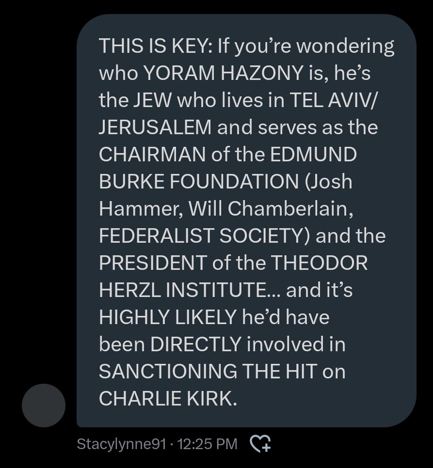 Hi, Monica. Allow me to reintroduce myself. I’m Jonathan (Decent), and you and I used to be friends before Israel/treasonous jew supremacy/zionist lunacy came between us. How are the Murder 1 and Accessory suspects from FedSoc/Edmund Burke/A3P, Human Events/NYYRC, Claremont Institute, UnitedHealth/Team8/8200, Elbit, Kela and Bronfman-Rothschild holding up since the murder of Charlie Kirk? I trust Hammer, Chamberlain, Davis, Blumberg, Posobiec, Kassam, Cheong, Hatch, Gilbert, Ackman, Maguire, Botha, Wolfe and Yazony are having lots of sleepless nights these days, no? Btw, I’m no fan of Ian’s, or any of the recently-exposed Casino swindlers, but I DO know that Candace Owens seems to be the only person in Charlie Kirk’s close circle of friends who truly gives a fuck about finding the truth about who really killed him. (It wasn’t a 30.06. It wasn’t Tyler Robinson.) PS: How are Kent Madsen, Echo Liu, Zachariah Qureshi, John Skjervem, Oren Barsky, George H. Zinn, The Heritage Foundation, Betsy DeVos, Erik Prince, Barb Van Andel, Blackwater, Epoch Times and the Tsinghua University bunch doing? Tell them hi for me if you should speak to any of them.