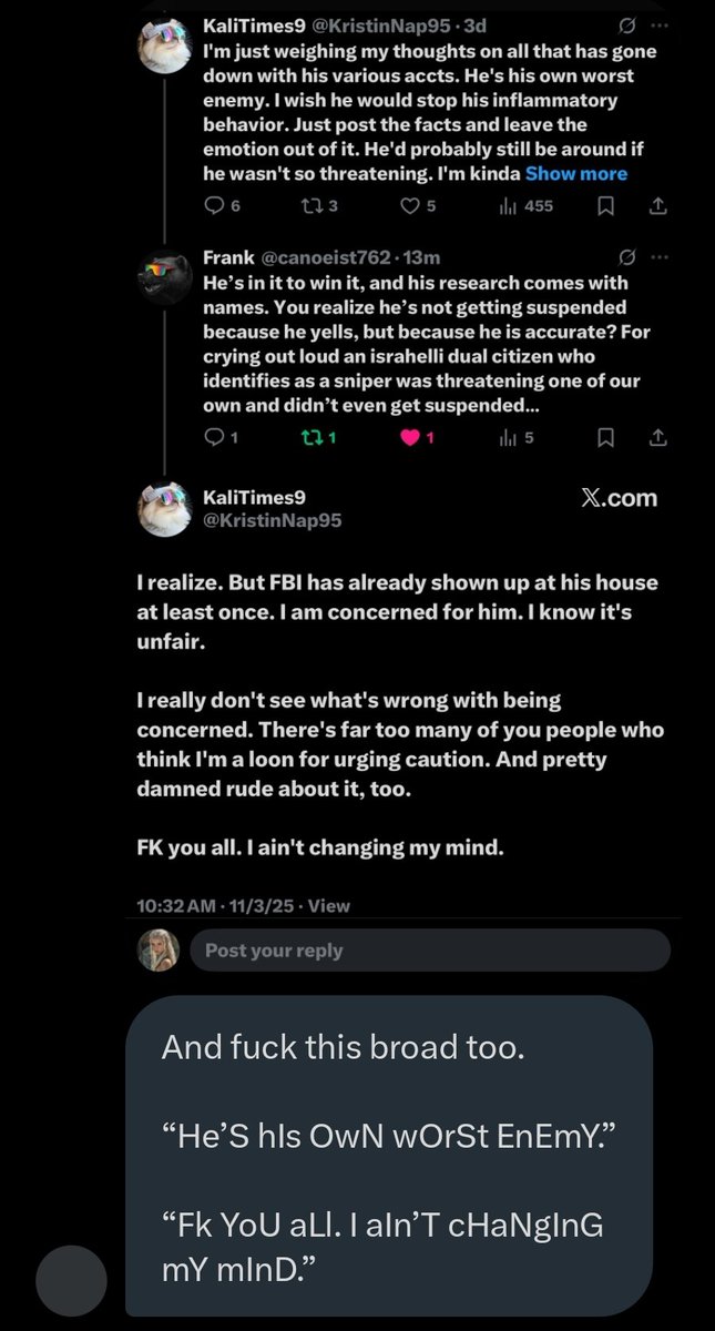 Oops, still had these. My previous account received a worldwide blackout on October 30, 2025. On November 2, 2025, I sat in Keith and meowllion’s space for nearly an hour (~45 minutes) with a standing ‘speaker request’ that never gets answered, despite also tagging Meowllion in several of the group chats we’re both in and repeatedly asking her for a mic. A week later, Keith and meowllion give ALLADIN, a well-known bad actor and IDF operative, a mic in their space AND even allowed him to advertise his GoFundMe, so listeners can donate to his ‘patriotic’ efforts. This was brought to our attention by my friend, The Fringe, in a GC that Meowllion and I (and Keith too, I think) are part of… “Ahh Keith? You let up the IDF guy? Gave him props for his post? Let him advertise his GoFundMe? WTF? He’s legit telling you he’s in Ukraine.” - The Fringe Good times. Lol. No, I’m not sorry for sandbagging. Get. Fucked.