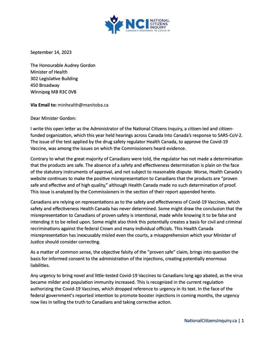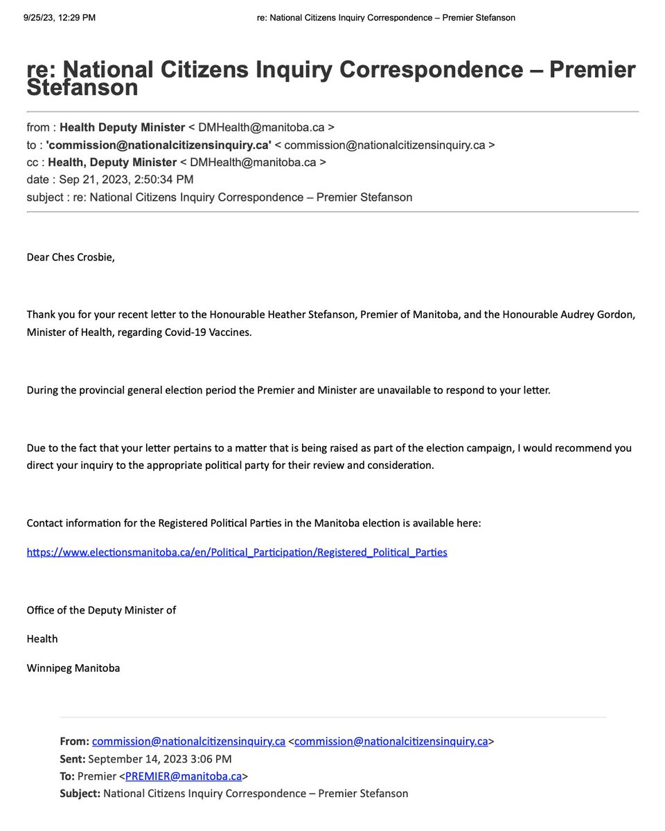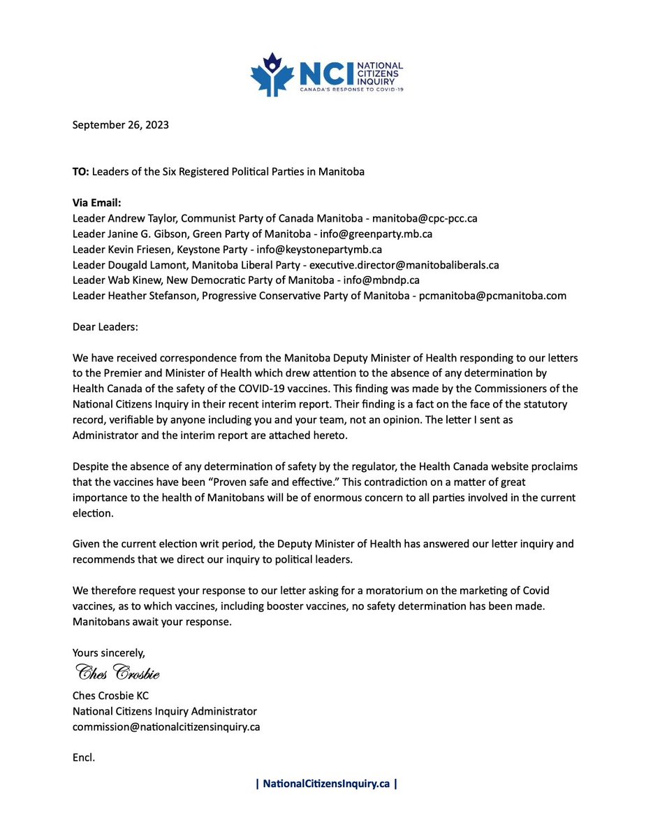National Citizens Inquiry Administrator, Ches Crosbie, has issued letters to both the Minister of Health for Manitoba and the six registered political parties in Manitoba. Below, you will find the contents of these letters, as well as the response from the Manitoba Deputy Minister of Health. #NCI #Canada #ThisisCanada #Manitoba #mbpoli #NeitherSafeNorEffective #cdnpoli