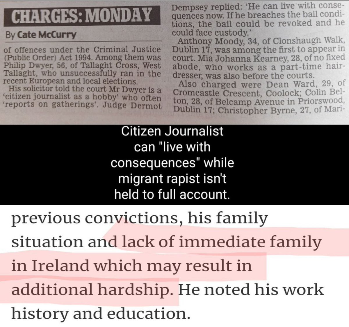 CITIZEN JOURNALIST MUST "LIVE WITH CONSEQUENCES"...BUT MIGRANT RAPIST GETS TWO YEAR REDUCTION IN SENTENCING DUE TO "ADDITIONAL HARDSHIP" By Susanne Delaney Five days ago, Geoffrey Kumah, 27 from Ghana (described as "a Clare resident") was sentenced for the rape of a 17-year-old at an Irish accommodation centre. When the victim texted him afterwards, he replied he "wouldn't do it next time." Judge Justice McGrath stated there were aggravating factors including Kumah failing to heed several vocalisations of "no". Despite this, the judge removed 18 months from the sentence and suspended the final six months. He did so because it would be harder for Kumah, in the judge's view, to serve a sentence without family present in the country, and this would cause him "additional hardship." When he says "additional" it is unclear what is meant. Quite frankly who cares about the "hardship" a rapist caused to themselves? Shouldn't hardship be a consequence of rape? This is one Judge in a long list who has given undue leniency to foreign rapists who should be deported... which would also solve the problem of not having family here. It was also reported in court that Kumah is with a woman who claims he is a good father figure to her child (which is supposed to point to his good character, as do his "church activities"). This rapist should be nowhere near children, and yet in this case his proximity to a child was used to curry favour. Elsewhere this week, Judge Dermot Dempsey said of Philip Dwyer's peaceful, lawful activities, "He can live with the consequences" of his journalism. It appears from footage that @PhilipDwyer_MOI was unlawfully arrested by Garda inspector Alan McDevitt who told him “You’re a prisoner now" (this Guard also unjustifiably battered Dwyer's legs with a baton in November 2023). Judge Dempsey stated in court that if Dwyer contravenes his bail conditions, he will face custody. Presumably part of those bail conditions involves not attending and filming any protest at Coolock. But if the riot police are acting within the law, then why would they not want to be filmed and reported upon? Why is the state seeking to heavy handedly prevent citizen journalists from reporting? Meanwhile they're giving male migrants the message that sexual offences will be dealt with leniently. Why? And all the while more and more of these sexual assault cases are coming before the courts. Victims are invariably young women or young teens and are often unknown to the perpetrators. Yesterday a man was before the court for sexually assaulting a young woman despite having arrived in Ireland 5 days previously. The Algerian man had already committed a string of offences in the 12 months he lived in the UK. Under the Dublin regulation he shouldn't even be here so why wasn't he sent home? Instead, he will be let out within 2 years, free to offend again. Nonetheless, we're told repeatedly that we are racist, and our concerns are unfounded, as the government continues to forcibly put these large groupings of illegal males into our working-class communities while silencing the locals with brutal force. Force that they're endeavouring to hide by using the courts and the threat of jail to silence those who are brave enough to report upon it. The actions of the state are increasingly undeniably hostile and authoritarian. They're using our own police force in a sinister, calculated and strategic manner against natives, in order to facilitate an agenda which appears to WANT to put our communities in clear and present danger. If anyone else can offer me a believable, cogent, innocent alternative explanation for what's happening (other than the "humanitarian duty" larping) then please do. The peace of mind would be most welcome in the increasingly nightmarish reality that's unfolding before our eyes.