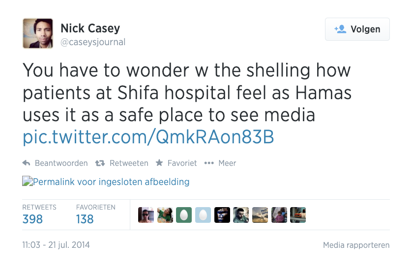 Nick Casey (@caseysjournal), who then worked as a correspondent for @wsj, tweeted that “You have to wonder w the shelling how patients at Shifa hospital feel as Hamas uses it as a safe place to see media”. By the next day, the tweet was deleted.