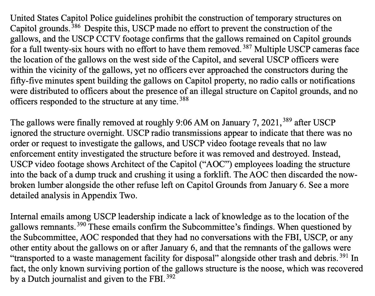 I think we can reasonably conclude that construction of the Jan. 6 "gallows" was a fed op. According to today's new J6 report, Capitol employees destroyed them the very next day and loaded the pieces a dump truck instead of collecting them as evidence. They didn't track the guys who made them, either, and the FBI claims to not know who built them.