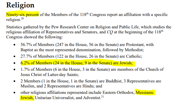 ๐๐๐๐ญ๐ก ๐๐จ๐ง๐ ๐ซ๐๐ฌ๐ฌ & ๐ญ๐ก๐๐ข๐ซ ๐ ๐๐ข๐ญ๐ก: This is the Religious background report of all current Congressional Representatives. You can easily find this report for yourself using the Congressional Research Service search engine on their website. I've went ahead and pulled the report for you. Source: https://crsreports.congress.gov/product/pdf/R/R47470 As stated in the report, - 96% of representatives within Congress report an affiliation with a specific religion. - 58.7% of representatives are Judeo-Christian. (Protestant, Methodist, Baptist, Latter Day Saints) - 27% of representatives are Catholic. - 6.2% of representatives are Jewish. - 4.1% of representatives have faithful views not normally listed. (Eastern Orthodox, Messianic Jewish, Unitarian Universalist, Adventist) - 4% of representatives are Agnostic. I wanted to highlight the Jewish percentage, as I am going to break down to you how theโก๏ธish Congress distorts this percentage, but also explain how @AIPAC's greedy influence overrides even these percentages you're seeing.