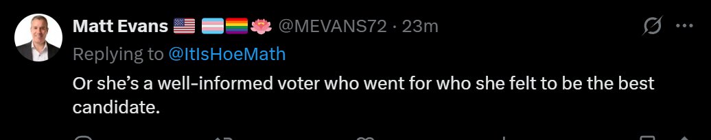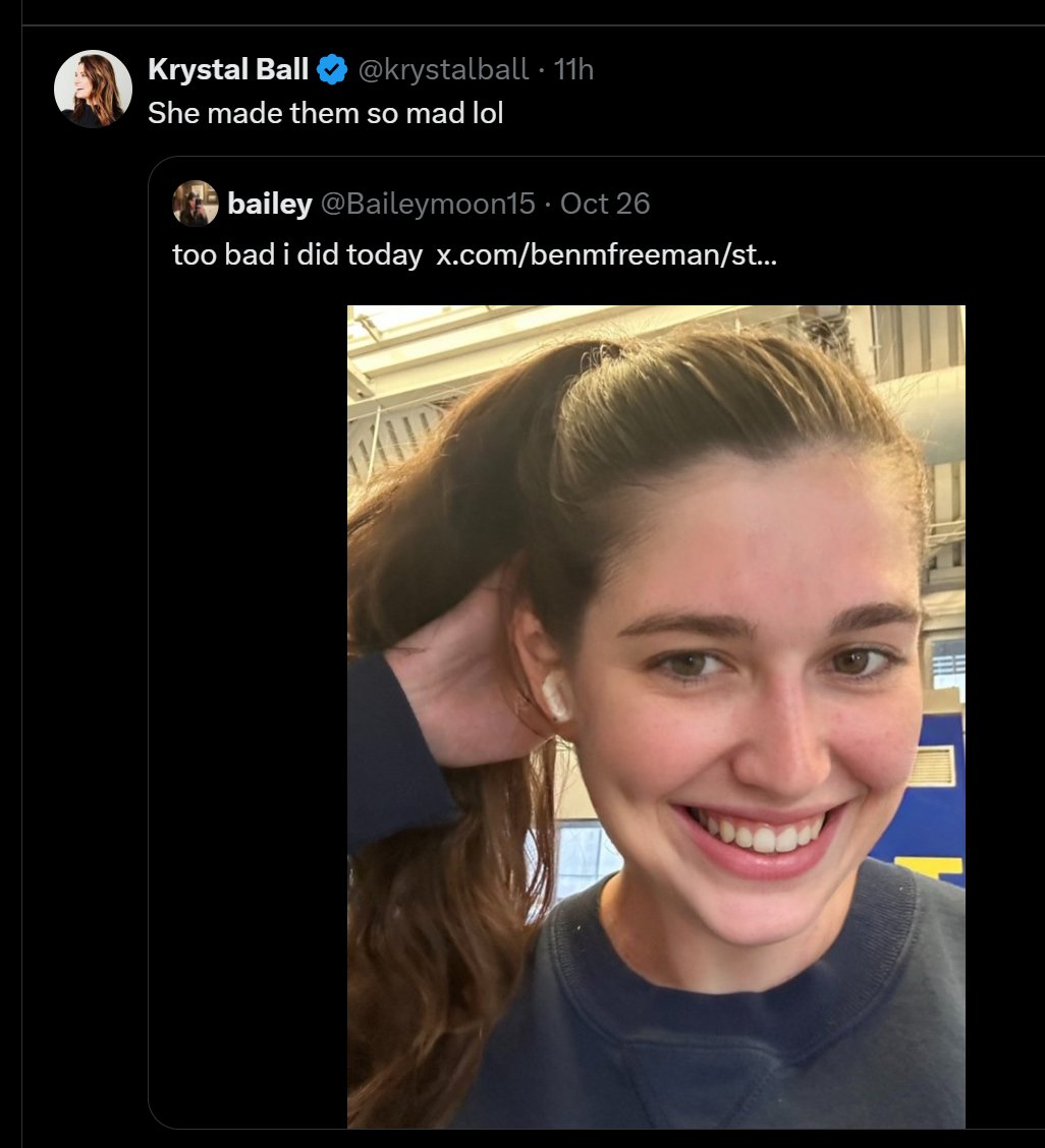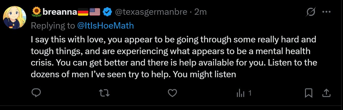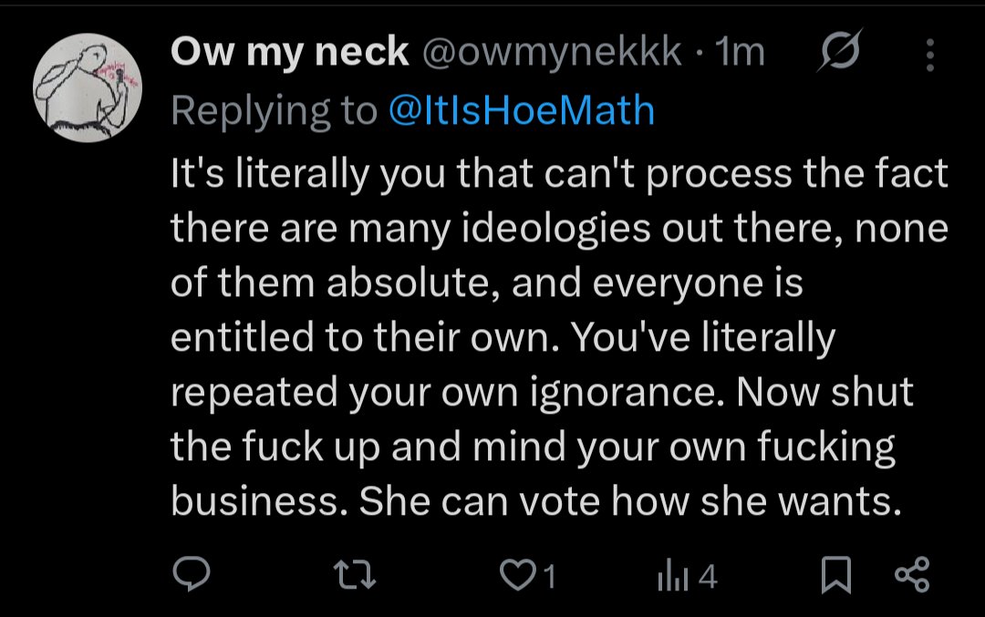 "when you're pretty and have a different view" This is actually seriously what happens in their minds. They cannot process the results of different ideologies any further than "I have an idea and you have an idea so we are equal," (like kindergarten) and then they look for what could be causing negative emotion, and of course the first thing they find is "everyone wants to fuck me." That's it! That's all that's in there. "Ideas are interchangeable and everything that happens is a response to my sexuality." And she has absolutely no clue why we wouldn't want people like this voting, and she never will.