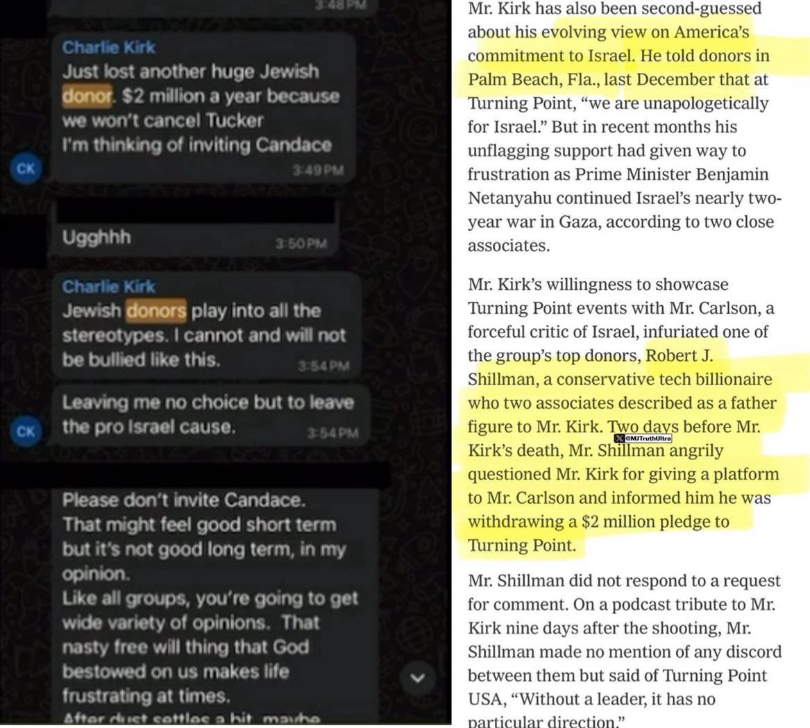 Candace Owens shares texts from a private group chat purportedly showing Charlie Kirk, two days before his death, lamenting that he lost "another huge Jewish donor" who was giving $2M a year. "Jewish donors play into all the stereotypes. I cannot and will not be bullied like this. Leaving me no choice but to leave the pro Israel cause," the text reads. Owens claims Josh Hammer (who was giving Kirk hasbara coaching up until the night before his death) was part of the chat.