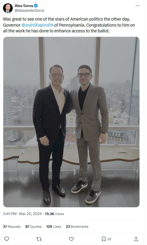 #BREAKING: George Soros' son, Alex Soros, meets with Governor of Pennsylvania Josh Shapiro and congratulates him on enhancing access to the ballot. GeneralMCNews https://t.co/qEDrktzvGD