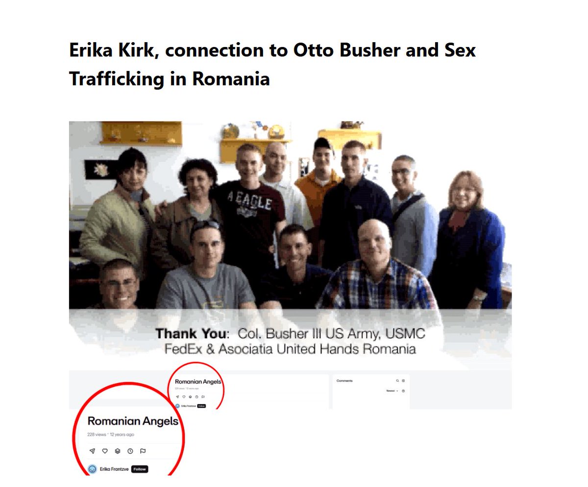 Erika Kirk was positioned within a powerful network from a young age. In interviews, she stated that her move from Ohio to Arizona was due to her mother’s work with the US Department of Homeland Security and Defense. Simultaneously, her divorced father, Kent Frantzve, who also lived in Arizona, was heading the Israel branch of Raytheon, a major military industrial complex corporation. Erika’s own public profile includes winning the Miss Arizona pageant and competing in the Miss USA pageant, which was owned by Donald Trump at the time. These biographical points establish what some observers see as clear connections to both the “Deep State” defense apparatus and pro-Israel interests. Her overseas work began with an NGO she founded at 17 in 2006, “Everyday Heroes Like You.” This evolved into the “Romanian Angels” project, which, according to a 2014 interview with Arizona Foothills Magazine, had “gone global” and was partnered with the United States Marine Corps to sponsor an orphanage in Constanta, Romania. This timeline suggests the program was active around 2011 or 2012. What is considered suspicious by critics is the apparent lack of an official closure date for the program on the internet, leading to speculation that it was terminated abruptly to avoid exposure as part of a wider criminal operation. The location and timing of this charity are central to the controversy. The Romanian city of Constanta and the surrounding region, including the town of Tandarei, were internationally identified as a hub for child trafficking during that exact period. A September 26, 2010, Al Jazeera article reported that dozens of people from Tandarei were going on trial for sending children to the UK to commit crimes, describing it as the center of an international investigation. Less than a year later, on October 15, 2011, the New York Times published a detailed exposé on the child sex trafficking crisis ravaging Constanta. This was not a new problem; an Israeli newspaper, Haaretz, had reported as far back as December 12, 2001, that Romania was probing a link between Israeli adoption agencies and organ trafficking. It can be argued that Erika’s program was shut down at the height of this public exposure, and that no subsequent state investigation occurred because the operation was allegedly protected by powerful elements within the US, Israeli, and British governments. In the Vimeo video about Romanian Angels, she expresses gratitude to Col. Otto Busher III of the US Army and USMC. Research, including translating Romanian news sources, uncovered reports that Busher was later named in a criminal complaint. A former translator at the American military base in Kogălniceanu, Ana Maria Nuciu, filed a complaint with Romanian prosecutors (DIICOT) in 2019. She alleged that a brothel operated on the base where underage girls were brought to service soldiers, and she named Otto Busher as one of the individuals who benefited from these services. The complaint requested that this “Kogălniceanu File” be connected to other high-profile trafficking cases in Romania, like the “Caracal-Deveselu File.” This direct link to a commander later accused of sex trafficking involving minors, combined with the charity’s location in a known trafficking hotspot, its ties to the military, and the family’s deep connections to defense and intelligence, makes the official narrative of a simple, innocent charity operation impossible to believe. This is a clear case of powerful interests operating with impunity, protected by their status, while the media “fact-checkers” and AI research tools work to discredit the overwhelming circumstantial evidence. WAKE TF UP 🚨