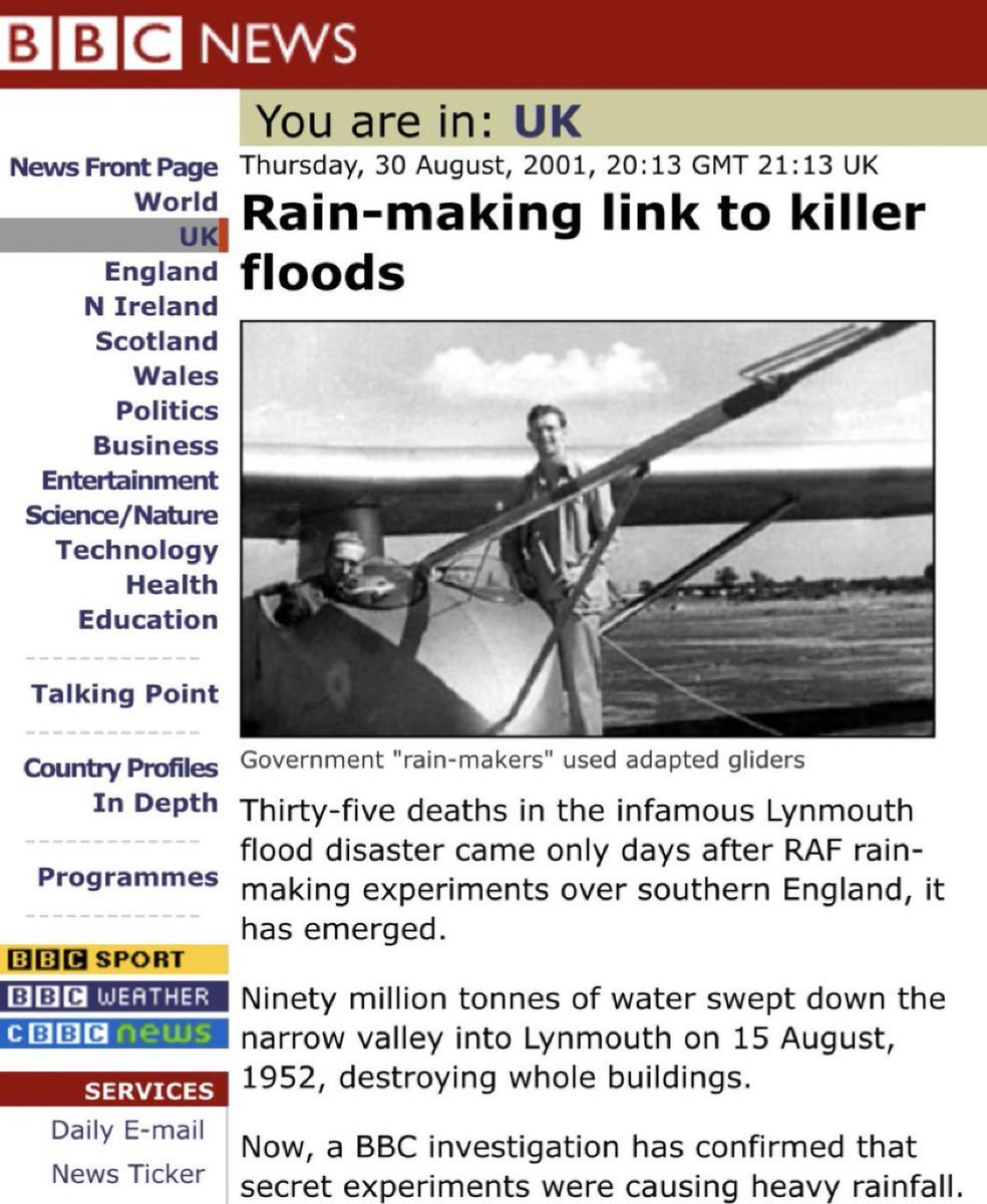 BBC News: 2001. โThirty-five deaths in the Lynmouth flood disaster came only days after RAF rain-making experiments over southern England, it has emerged. Ninety million tonnes of water swept down the narrow valley into Lynmouth on 15 August, 1952, destroying whole buildings.โ https://t.co/mnwtKdyDac